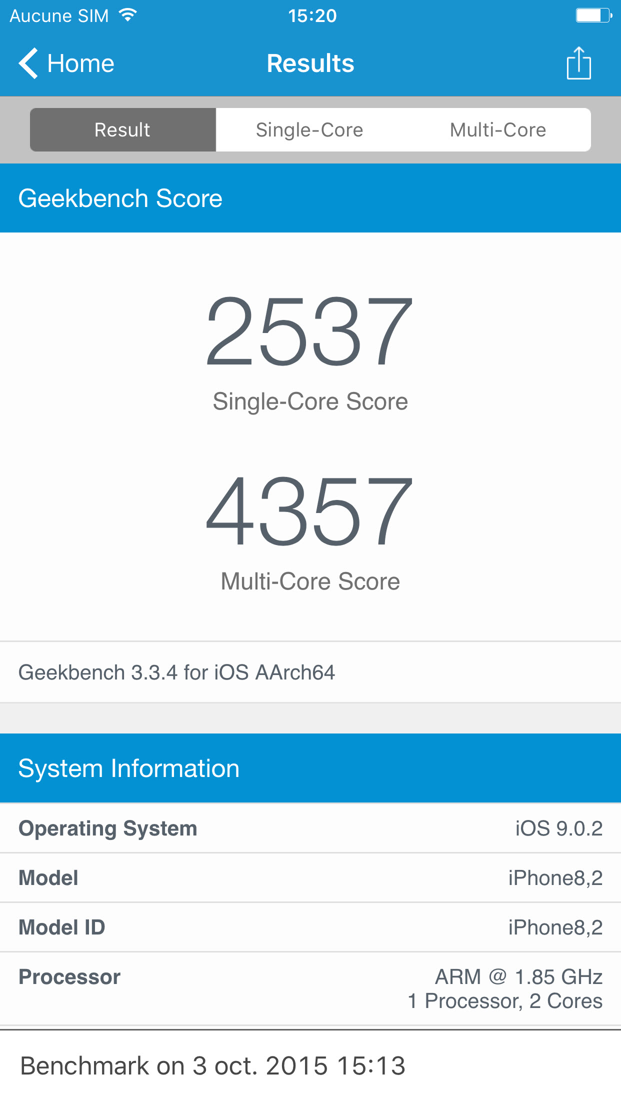 À titre de comparaison, un Samsung Galaxy Note 5, référence actuelle au niveau d’Android, atteint des scores respectifs de 1475 et 5012 aux tests simple et multicœurs. L’iPhone 6s Plus fait donc mieux lorsqu’il utilise un seul cœur, et s’approche fortement du Note 5 en multicœurs, en ayant 2 cœurs au lieu de 8. Apple a donc fait un excellent travail à ce niveau. Ajoutons à cela le fait qu’Apple a enfin décidé de faire passer ses iPhone à 2 Go de RAM au lieu de 1 et la fiche technique devient très intéressante.