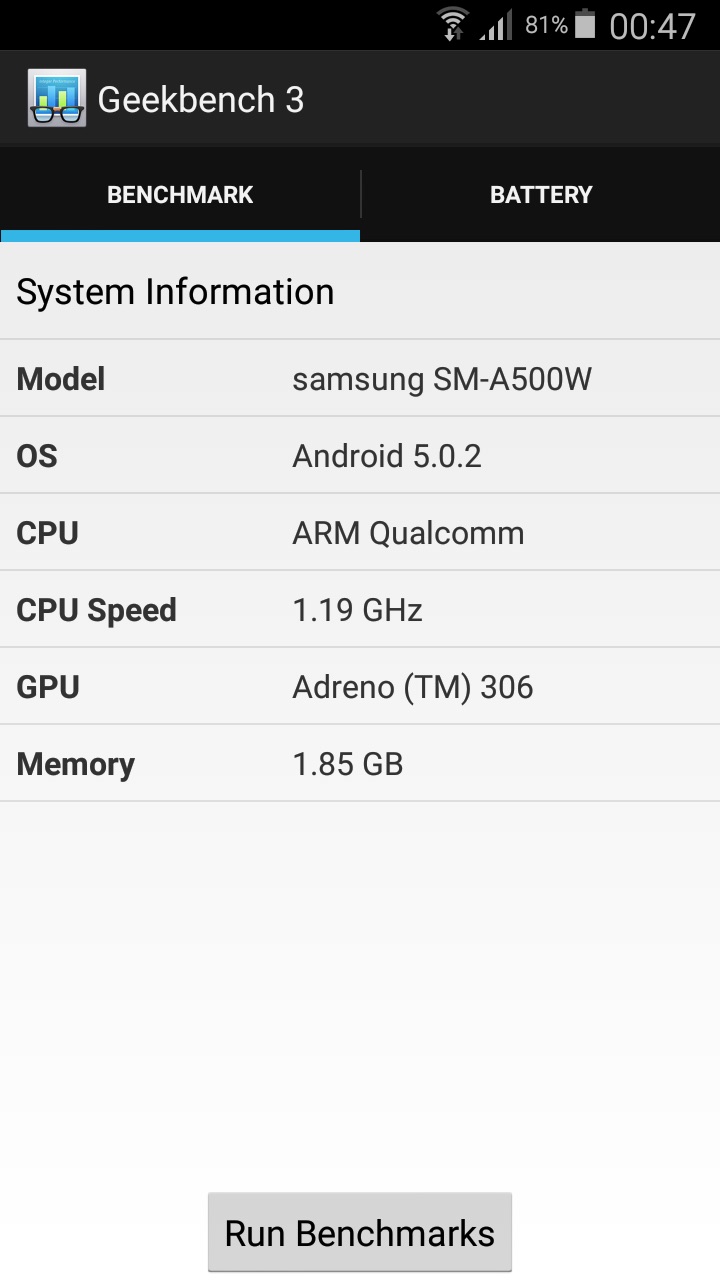 Après avoir effectué un test de batterie sur Geekbench 3, il a fallu 6h17 au Samsung Galaxy A5 pour s’éteindre. A titre de comparaison, il aura fallu 6h10 à un HTC Desire 510 et 6h15 à un ZTE Grand X 2 pour s’éteindre dans les mêmes conditions. On est donc dans la moyenne pour cette gamme d’appareils.