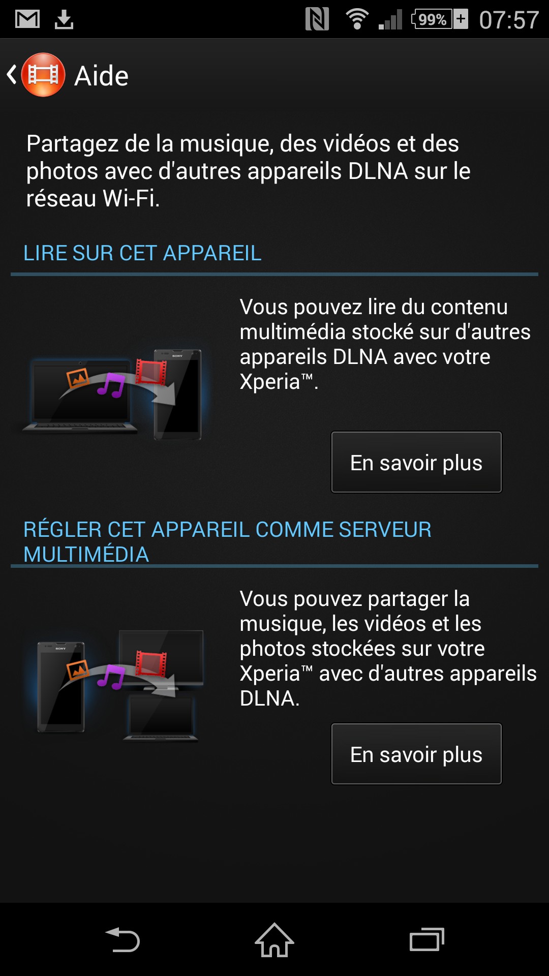 On apprécie l’effort de simplification proposé par Sony sur des sujets pas forcément triviaux. Le service le plus impressionnant est sans aucun doute constitué par l’application Throw qui concentre toutes les connexions sans fil : le NFC appelé « connectivité par simple contact »,  la technologie DLNA, appelée pour l’occasion « serveur multimédia », en passant par la traditionnel connexion USB, où Sony explique clairement la différence entre la connexion « stockage de masse » et « transfert multimédia ».