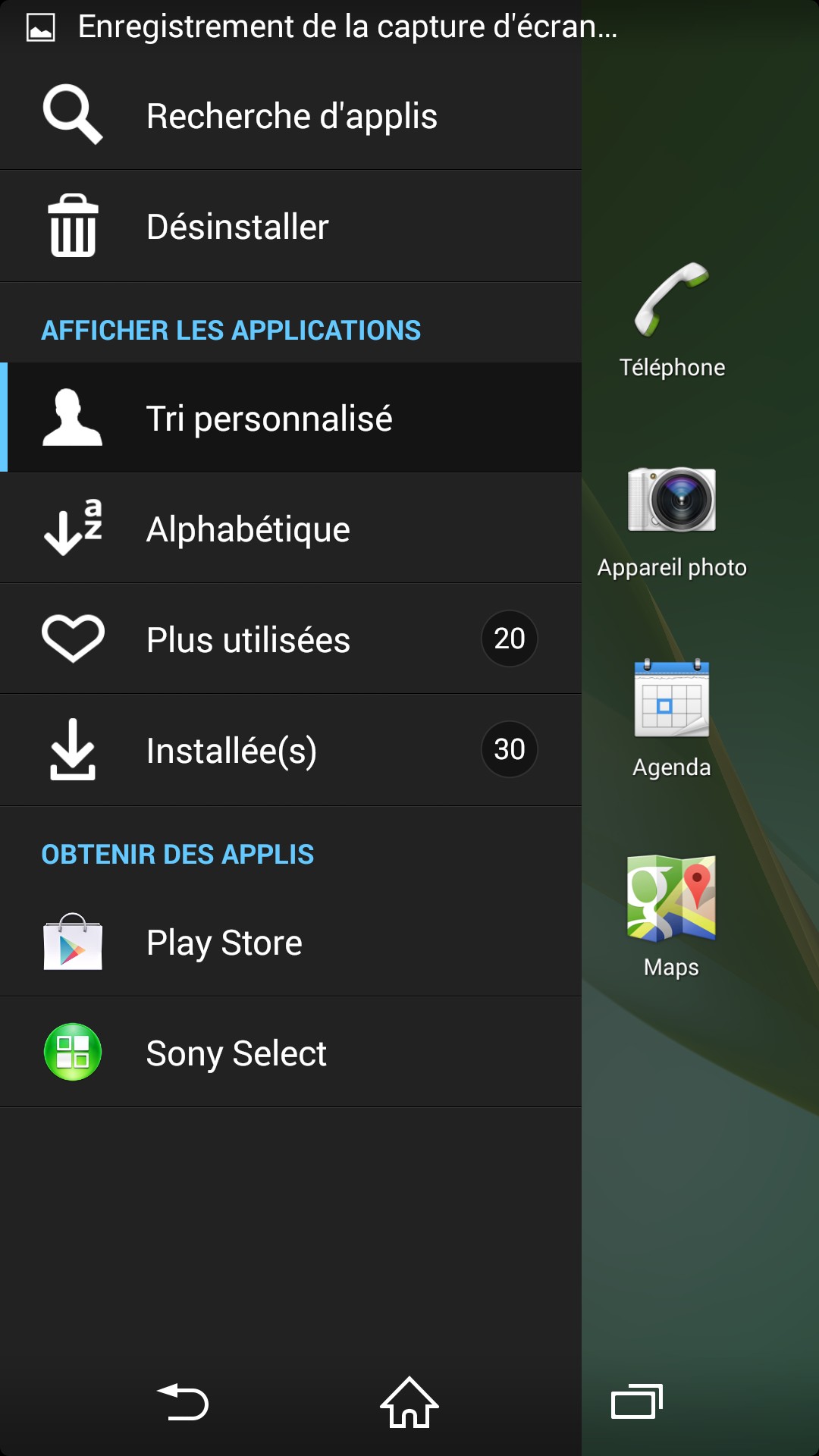 Mais Sony ne s’arrête pas à l’amélioration ergonomique des fonctions standards : le constructeur ajoute la capacité de personnaliser l’interface plus en profondeur. Par l’intermédiaire d’un changement de thème, on modifie à la fois l’ensemble des écrans en une action, et on accède à des paramétrages plus poussés, comme la personnalisation des 3 boutons de navigation.