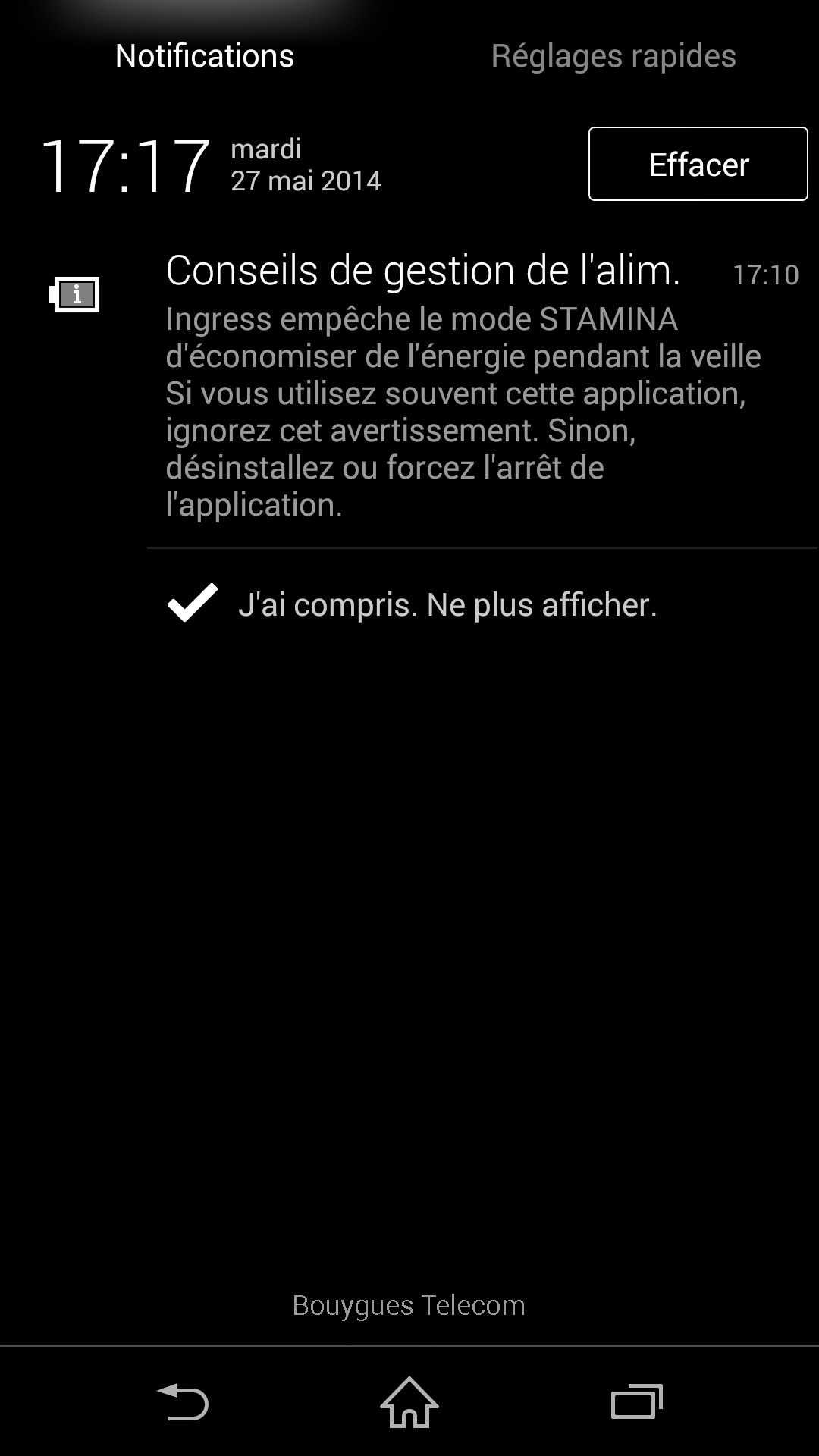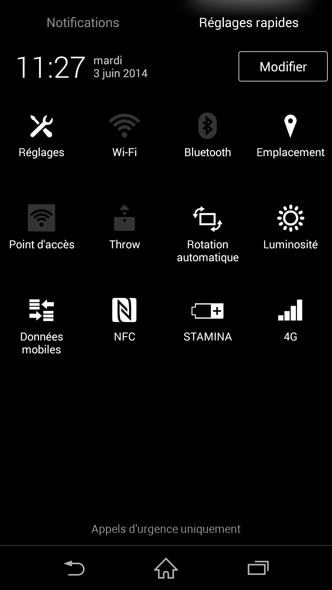 Le second, accessible également en descendant le volet de notification, mais avec 2 doigts, permet d’accéder à des boutons d’actions rapides, associés généralement au menu Paramètre. On aurait apprécié que le constructeur ajoute plus de possibilités parmi les boutons disponibles dans ce second volet, même si on trouve, en sus des boutons standard, l’accès au mode Stamina (mode d’économie d’énergie propre à Sony).