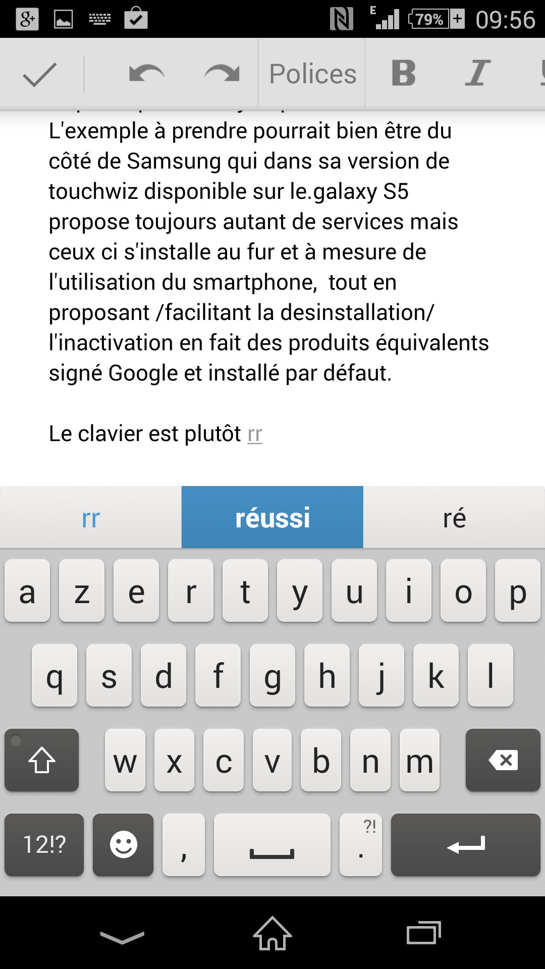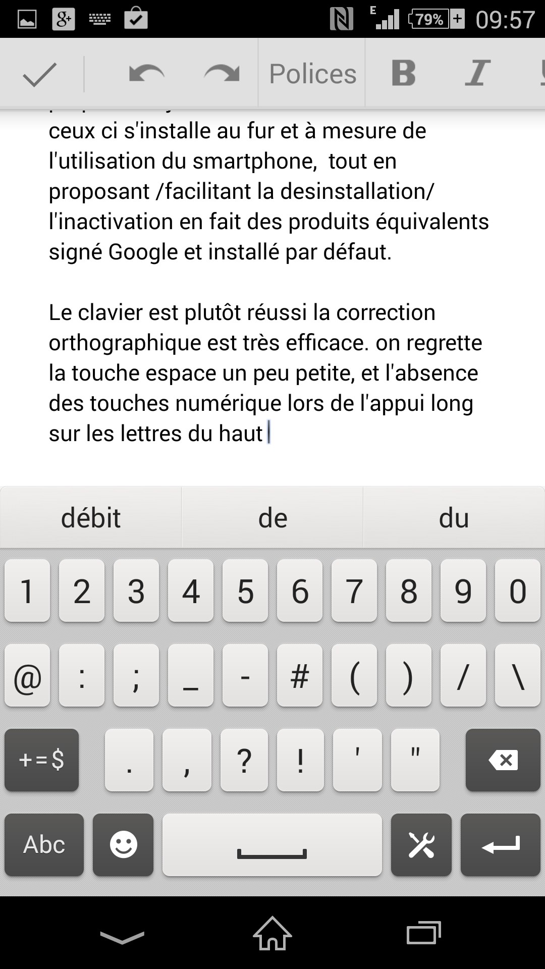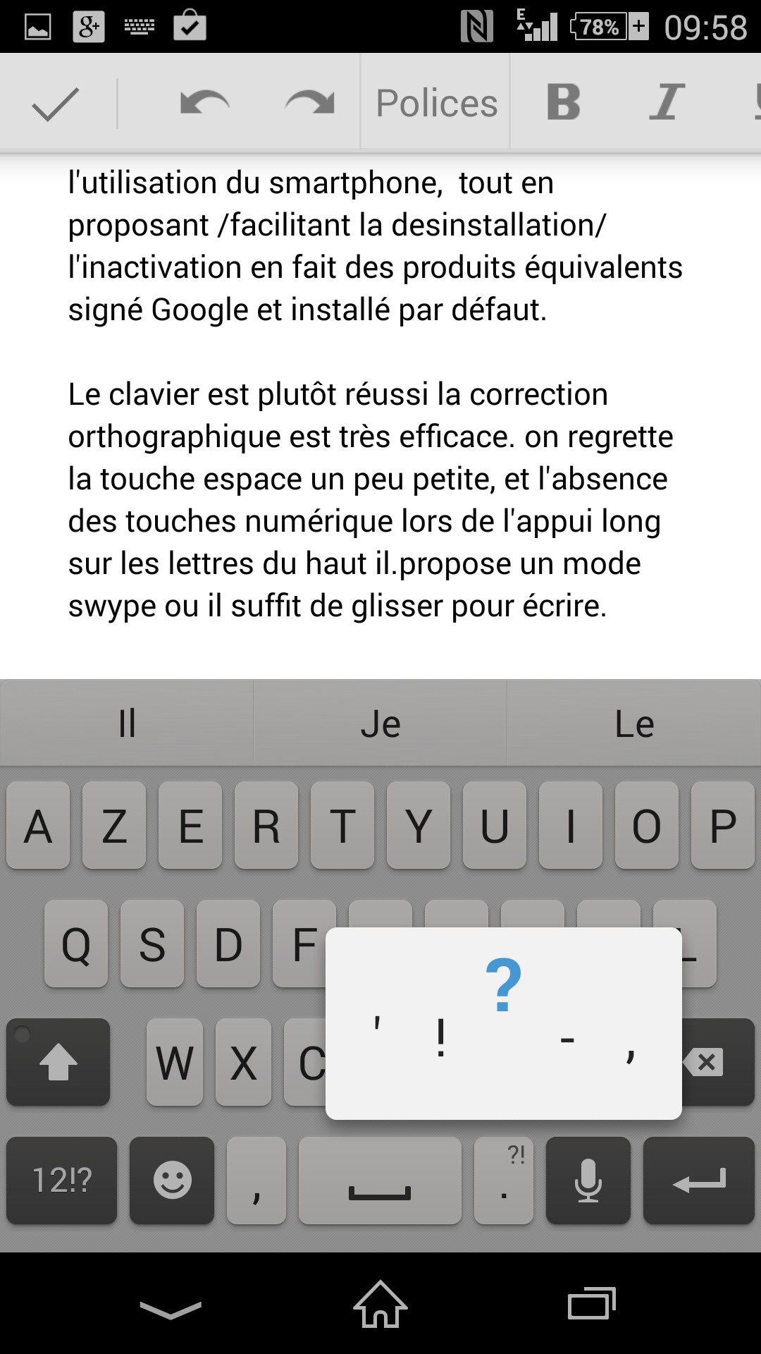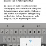 Le clavier est plutôt réussi grâce à des touches suffisamment grandes et un écran particulièrement réactif et précis. On regrette la touche espace un peu petite, et l’absence des touches numériques lors de l’appui long sur les lettres du haut. La correction orthographique qui accompagne ce clavier est très efficace, et un mode Swype est proposé, où il suffit de glisser le doigt sur l’écran pour écrire. Les principales ponctuations de français sont facilement accessibles, excepté le (+) (particulièrement utilisé sur le réseau social Google plus).
