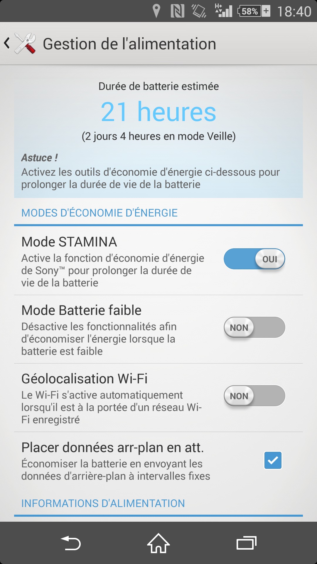 Sony propose judicieusement un ensemble d’options pour optimiser l’utilisation de la batterie, dont un mode Stamina qui permettra de réduire discrètement la consommation data en période d’inactivité. On reçoit également plusieurs messages d’avertissement en cas de surconsommation d’une application.