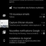 La barre de notification reste conforme à la version apparue sur Android en 4.2. On dispose de 2 volets : le principal, classique et historique (repris par Apple pour ses iPhone et plus récemment par Microsoft sur Windows Phone 8.1), contient les notifications déclenchées par les différentes applications (comme la réception de SMS, d’appels, etc.).