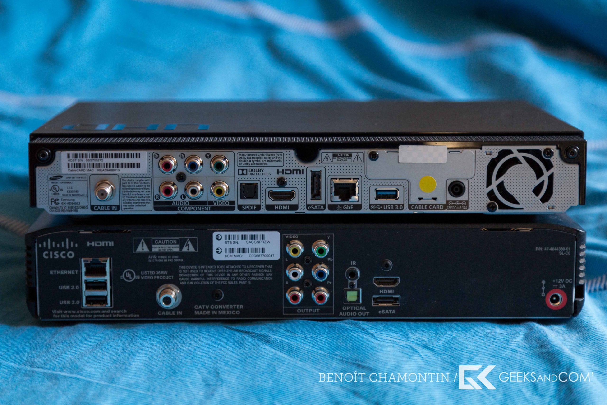 Le design du terminal illico 4K de Samsung n’est pas dans la continuité du terminal X8 de Cisco et proposé par Vidéotron depuis quelques mois. On oublie ici les lignes arrondies pour un design très rectiligne, bien plus proche des terminaux Cisco Explorer 8642 proposés depuis maintenant plusieurs années. Le terminal 4K utilise un boitier en métal, à la différence du illico X8 qui était entièrement en plastique. Les matériaux utilisés sont donc plus nobles et devraient aider à la dissipation thermique. En revanche, bien qu’il s’agisse ici d’une question de goûts, j’ai tendance à préférer le design du modèle X8.