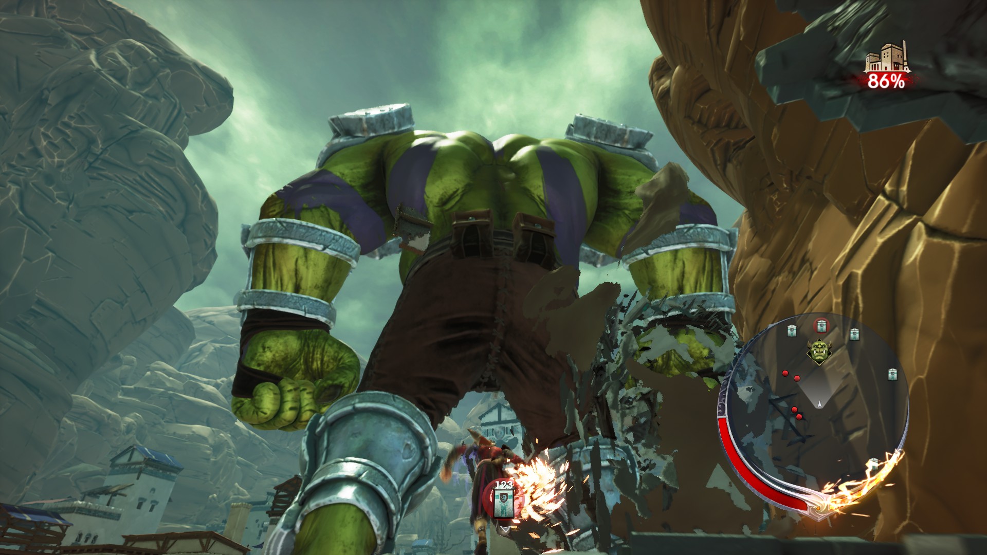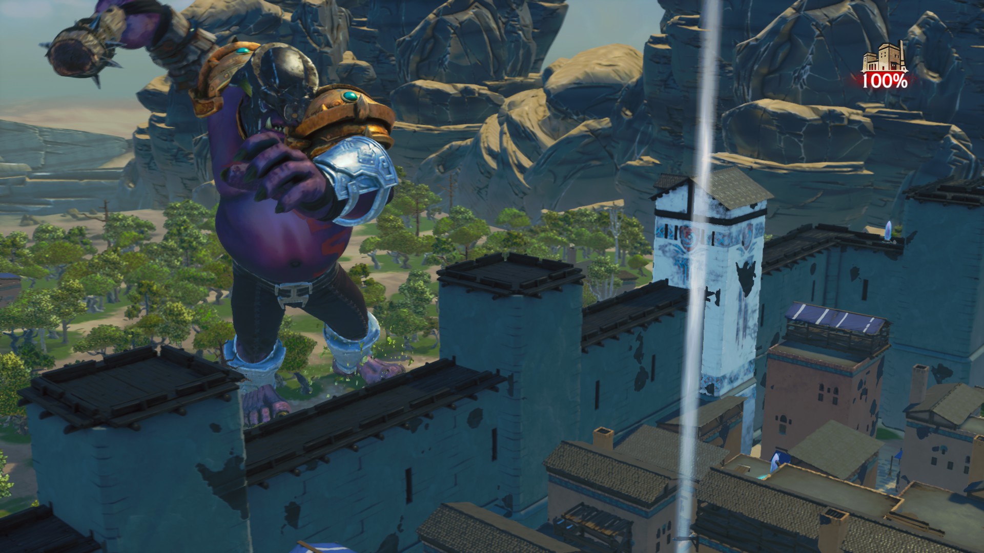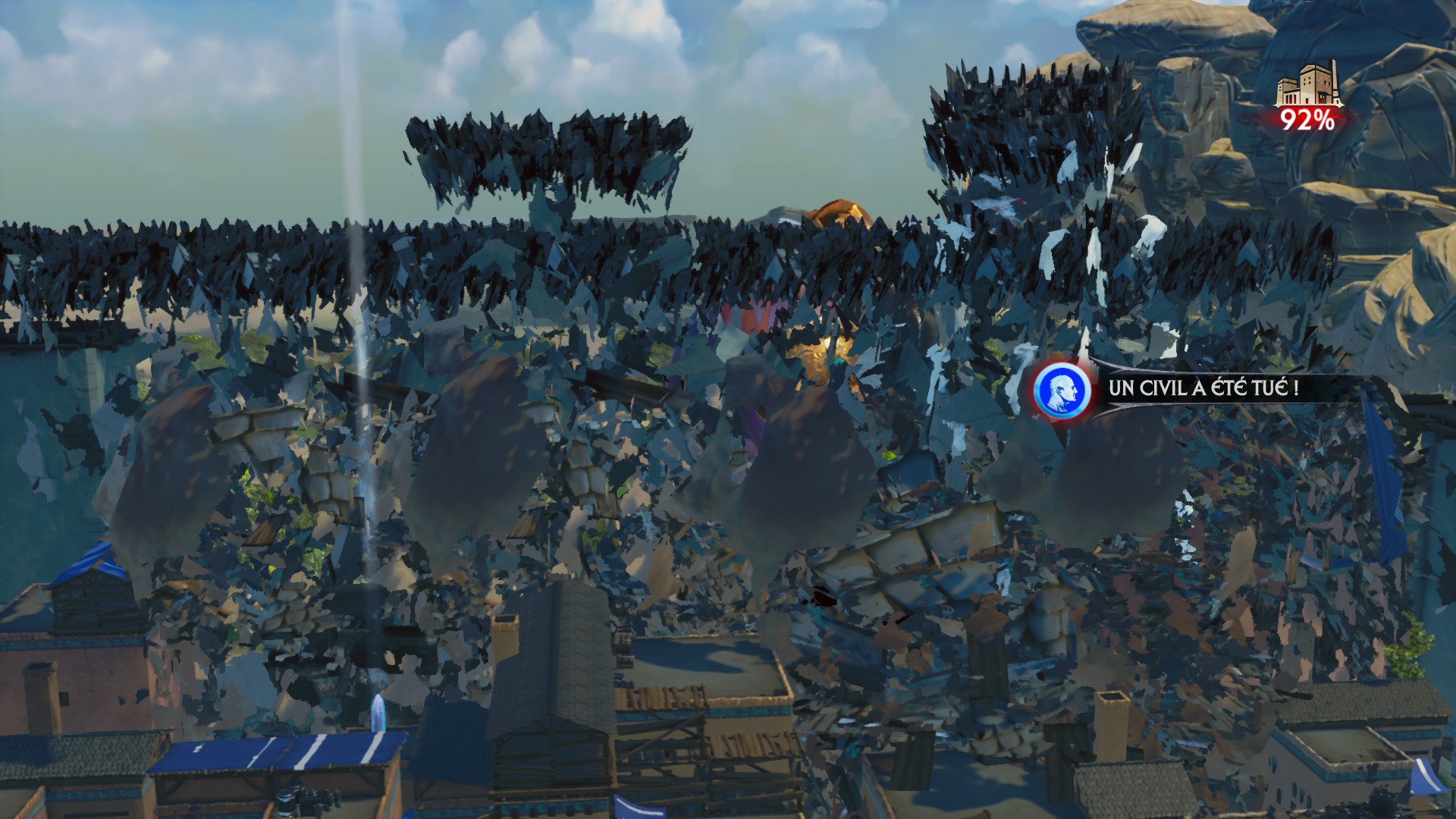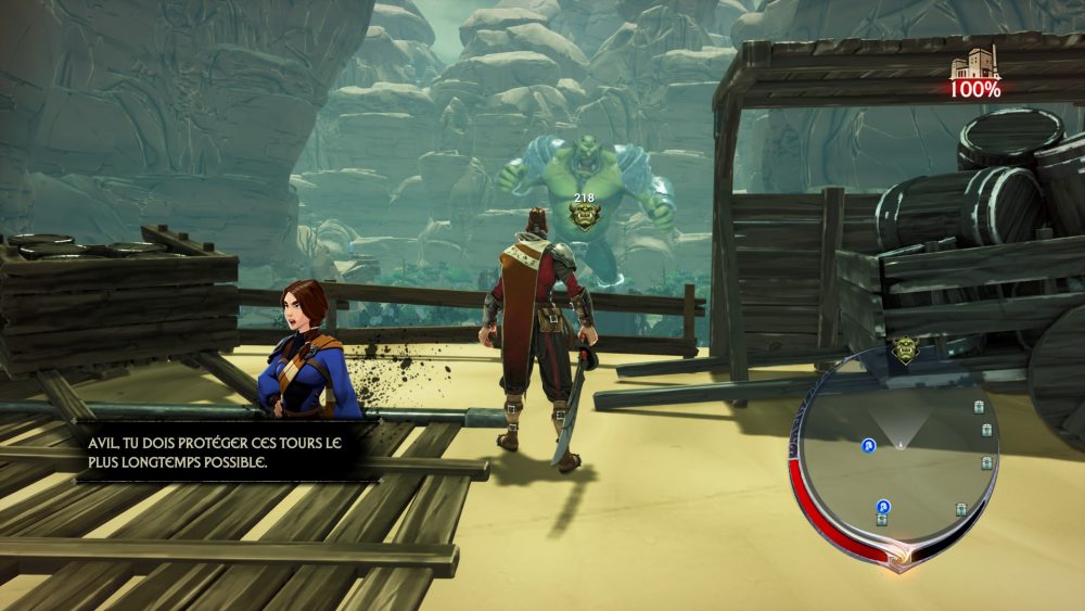 Vous ne pouvez pas prendre le temps de mettre l’accent sur vos ennemis au sol parce que vous devez affronter 2 à 3 orques géantes. Pendant ce temps, les petits orques massacrent les citoyens et font progressivement descendre la barre de pourcentage de destruction.