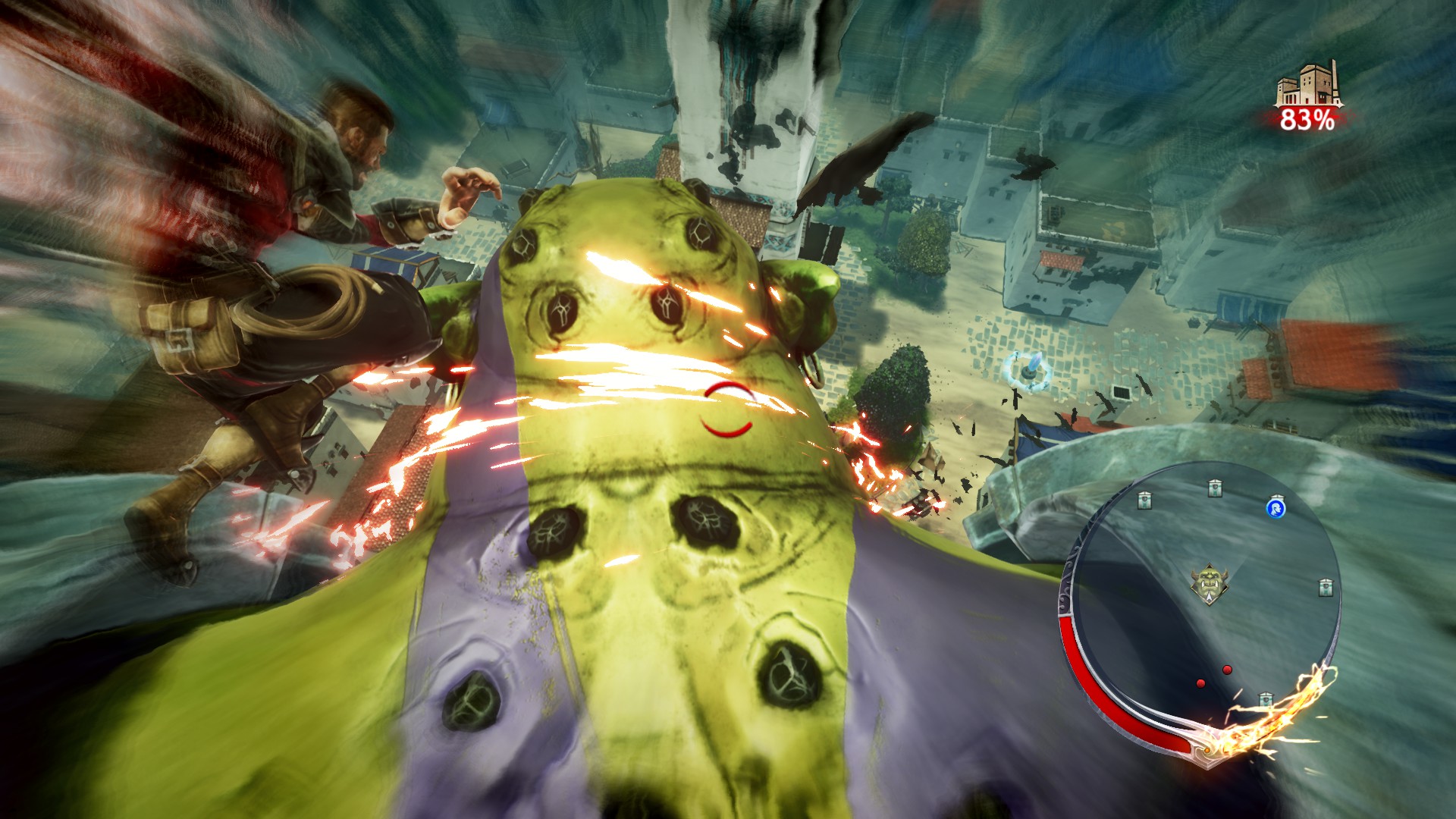 Afin de réussir votre mission, ce n’est rien de très élaboré. Vous devez simplement charger votre épée runique et une fois chargée, l’utiliser afin de décapiter la tête de votre ennemi. Pour charger votre épée, vous devez sauver des citoyens, tuer les petites orques au sol ou alors détruire des pièces de l’armure des orques géantes.