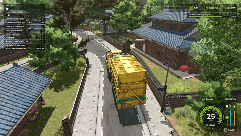 En termes de terrains de jeux, Farming Simulator 25 propose 3 cartes. Deux entièrement inédites (l’Asie et l’Amérique du Nord) et une autre qui était déjà présente dans le dernier titre de la franchise (l’Europe). Comme plusieurs joueurs, j’imagine, je me suis dirigé pour ma première partie vers la carte asiatique. C’est celle-ci qui se démarque le plus et qui apporte un vent de fraîcheur à la série. Que ce soit au niveau des cultures possibles ou du centre-ville assez petit et typique de la région, la carte offre une vision différente de l’agriculture. Pour ce qui concerne la carte américaine, nous nous retrouvons avec quelque chose de plutôt classique. Des plaines à perte de vue et beaucoup d’espace pour cultiver. Pour finir, la carte européenne inspirée de la Pologne regroupe des étendues parsemées d’étangs et de rivières.