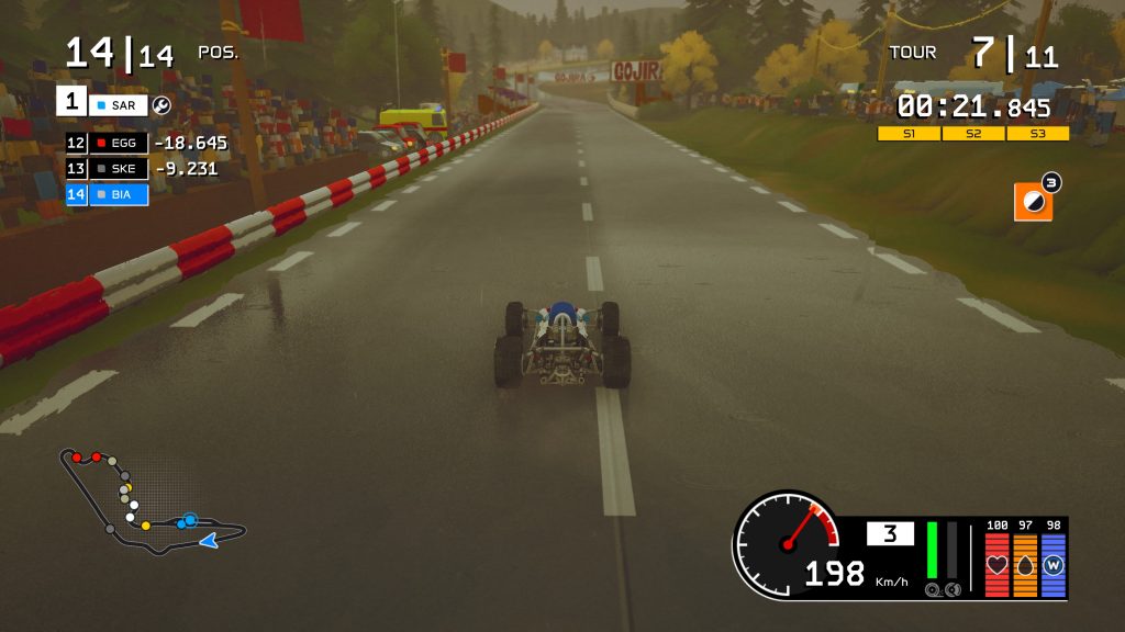 On pourrait croire que ce style coloré et accessible annonce une expérience d’arcade légère. Pourtant, une fois lancé dans une course, Formula Legends révèle une simulation surprenante. La gestion de la température des pneus, de leur durabilité ou encore leur réaction aux changements météos viendront bouleverser votre manière de jouer. On ne peut pas foncer tête baissée en espérant gagner uniquement sur des réflexes. Un peu comme dans la vraie vie, nous devons savoir quand attaquer, quand ménager sa voiture et comment adapter son pilotage à une piste humide ou sèche. Il faut aussi gérer notre trajectoire en économisant au maximum notre monoplace.