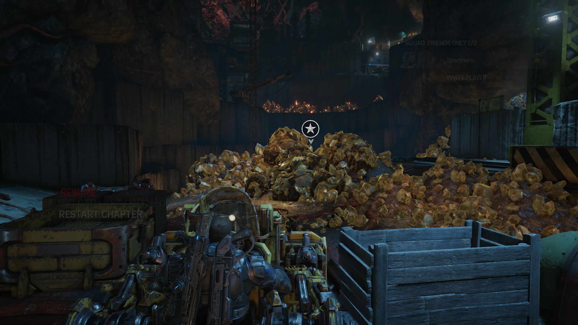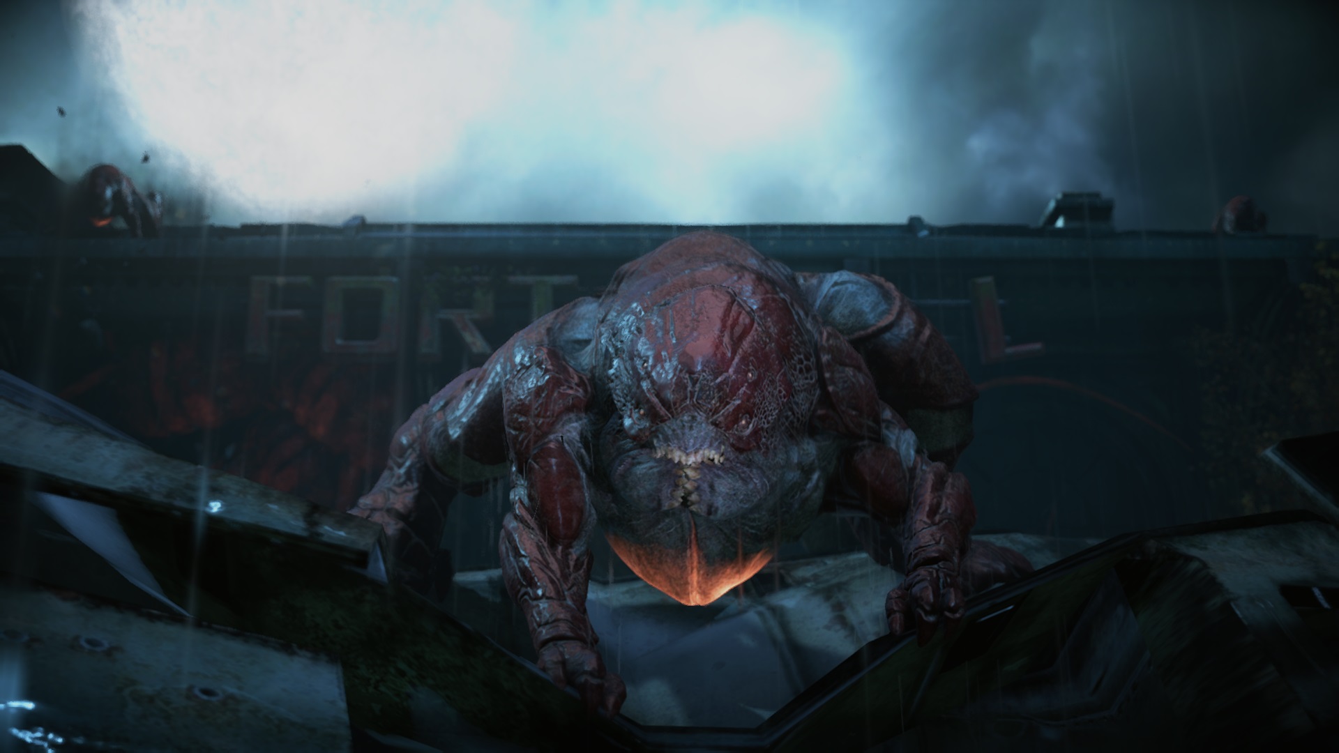 Gears of War 4 nous propose aussi une atmosphère sombre et mystérieuse tout en étant, malgré tout, un des épisodes les plus verts parus jusqu’à maintenant. Durant l’aventure, on découvre que la planète Sera se remet tranquillement de la longue période de guerre qu’elle a connu ce qui laisse place à un peu de verdure. On le constate surtout durant la première partie du jeu lorsqu’on visite la première colonie où on voit que la nature prend beaucoup de place. Malheureusement, il y a aussi des conséquences de la guerre qui sont beaucoup moins glorieuses comme l’arrivée des Windflares, un mélange de tornades et d’orages, qui viennent souvent surprendre nos héros durant l’aventure. Cela ajoute à l’atmosphère sombre de jeu bien qu’ils sont très colorés et joli à regarder. Ce qui m’a particulièrement impressionné c’était l’effet du vent de ces Windflares qu’on doit combattre tout en affrontant des ennemis. Puis, suite aux premières heures, c’est là que le jeu devient vraiment plus sombre. Markus se fait kidnapper et pour suivre les traces du monstre qui le détient, l’escouade se transporte dans les recoins les plus noirs de Sera pour sauver le père de J.D. Bref, la découverte des Swarms et la recherche de leur provenance ajoute beaucoup de mystère à l’aventure.