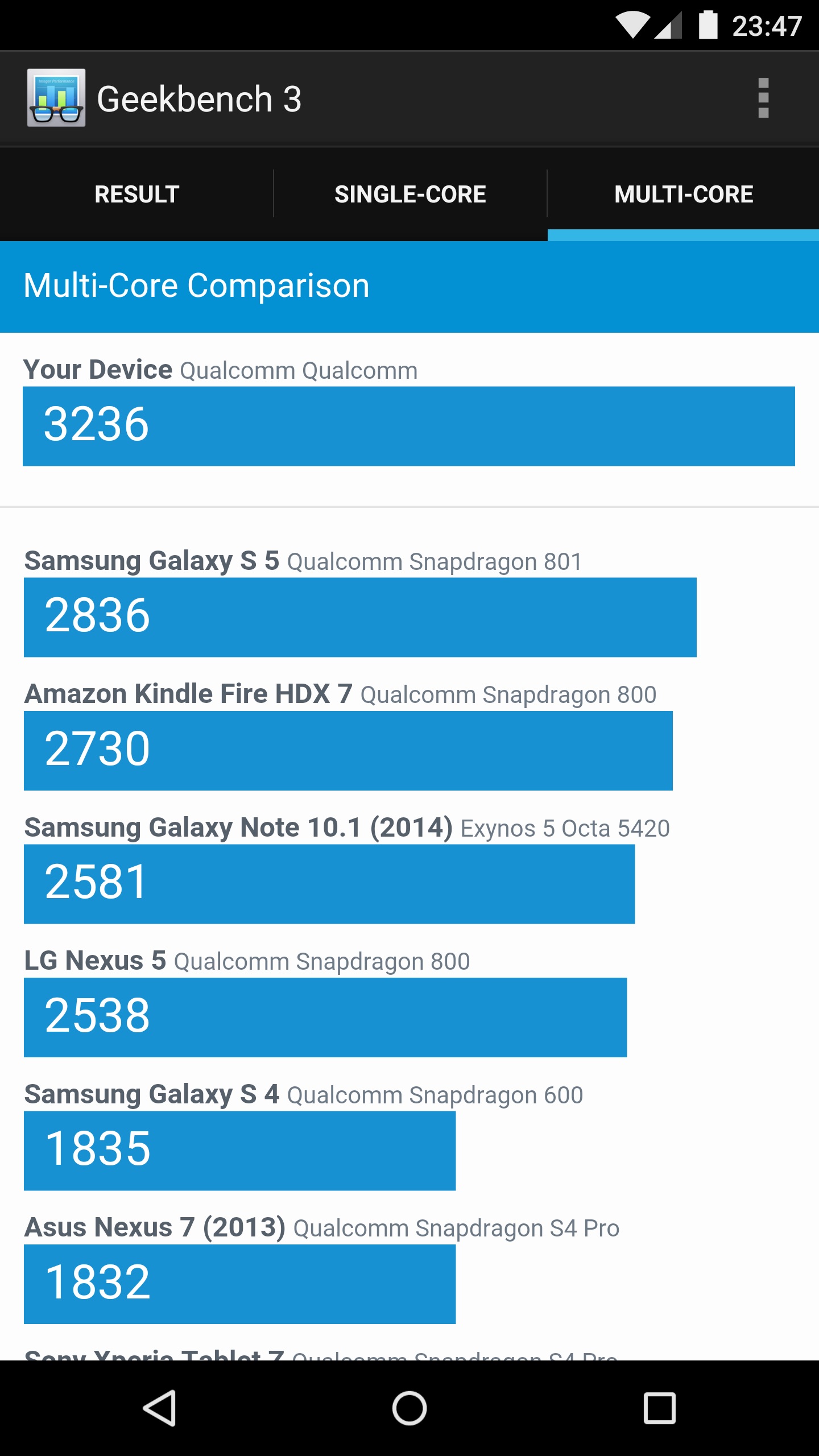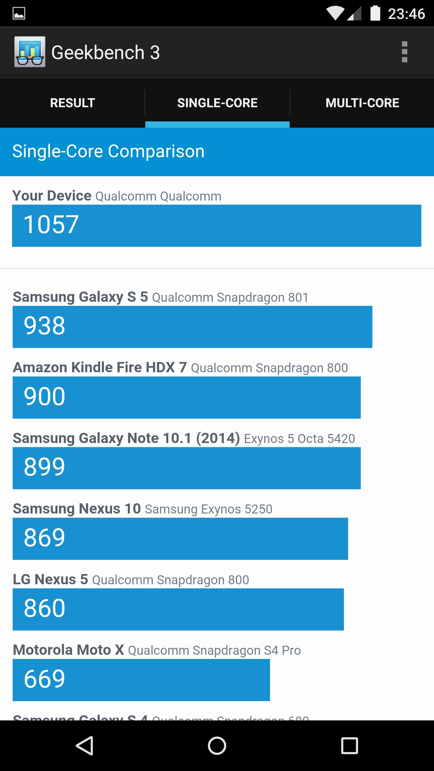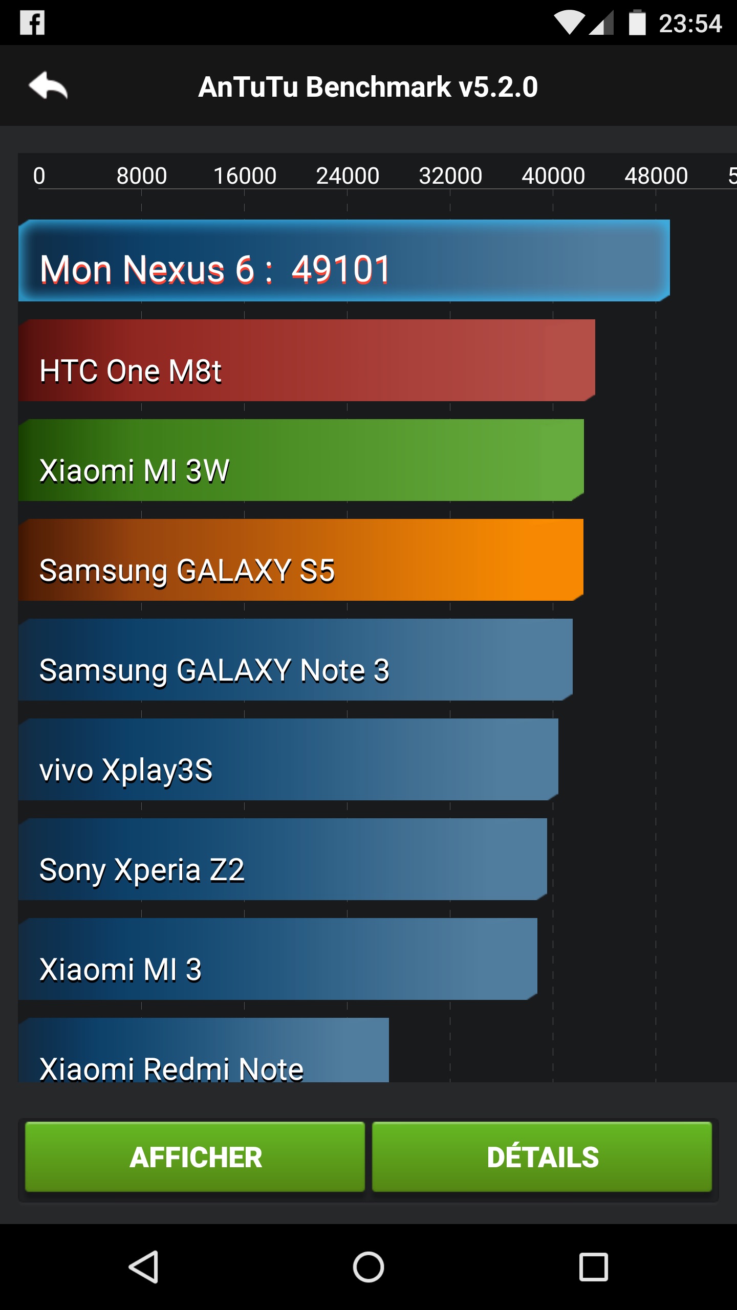 Pour les amateurs de chiffres, voici les résultats obtenus par le Nexus 6 dans les différents logiciels de Benchmark. Ceux-ci sont d’ailleurs très proches du Samsung Galaxy Note 4, même s’il arrive que le Nexus 6 prenne le haut du classement dans certains tests.