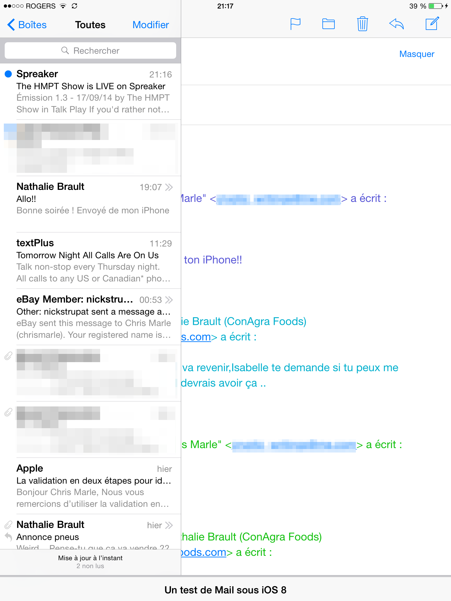 Une des grosses nouveautés dans iOS 8 est Continuity, qui permet de prendre des appels vocaux avec un iPad (ou un Mac) et même de répondre à des SMS (les « Green Bubbles », comme disait Craig Federighi). Nous avons trouvé cette addition fortement intéressante puisqu’il nous était possible de communiquer via SMS avec tous nos contacts avec notre iPad, réduisant ainsi la dépendance à notre iPhone. Même histoire avec les appels, mais nous recommandons d’utiliser le mode haut-parleurs ou avec écouteurs mains libres parce que, honnêtement, il n’est pas encore tendance d’utiliser des téléphones de 7,9″ ou 10,9″… Mais ça ne devrait pas trop tarder.