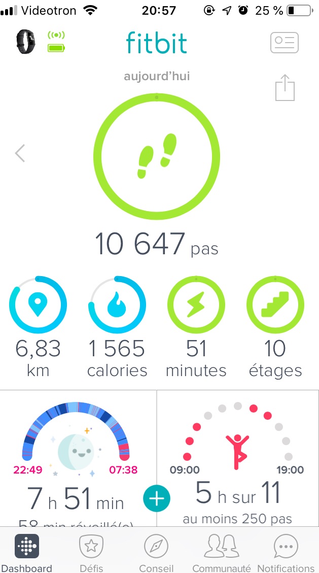 Côté autonomie, les 7 jours affichés par Fitbit semblent très bien évalués. En effet, après 5 jours d’utilisation la batterie affichait encore une capacité de 52%. Un très bon point !