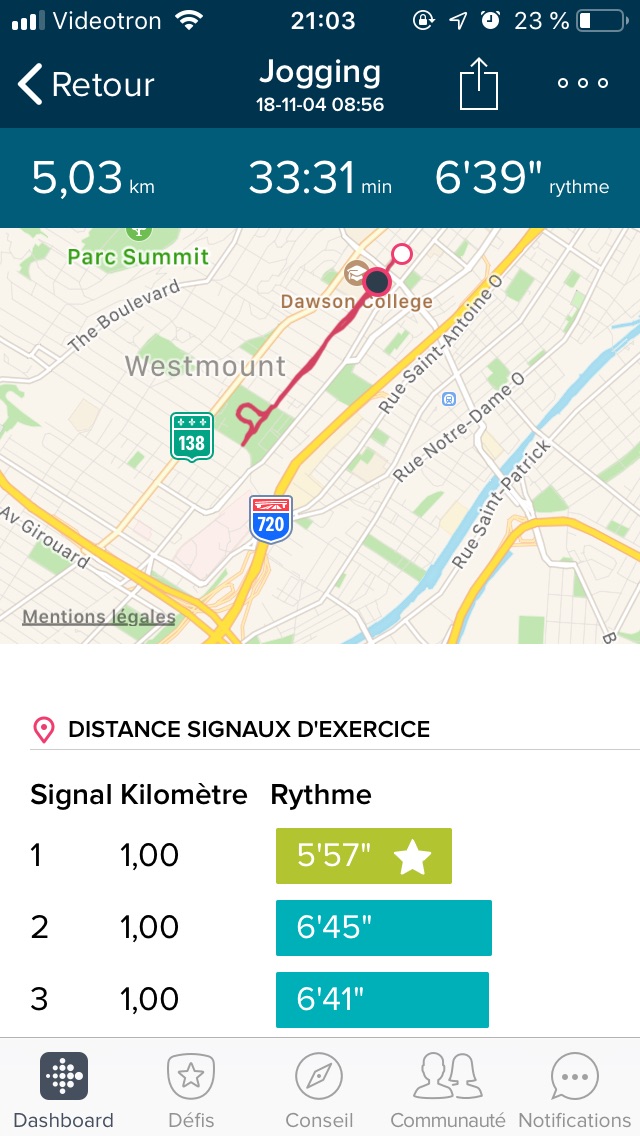 Concernant la course, il est dorénavant possible de se fixer un objectif avant votre session. Cet objectif peut être une distance, un temps ou une quantité de calories à brûler. Pour ma part, j’avais choisi un objectif de 5 km. N’étant pas équipé d’une puce GPS comme la Ionic par exemple, il faut garder avec soi son téléphone. Là-dessus, j’ai été un peu déçu, car l’intérêt d’une telle montre est justement de se passer de son téléphone et d’une application comme Runtastic. Il est cependant inutile de synchroniser votre montre avec l’application Fitbit, c’est toujours ça de pris. La Fitbit vibre à chaque kilomètre parcouru et à mi-distance. Ce qui est vraiment pratique pour savoir où on en est.