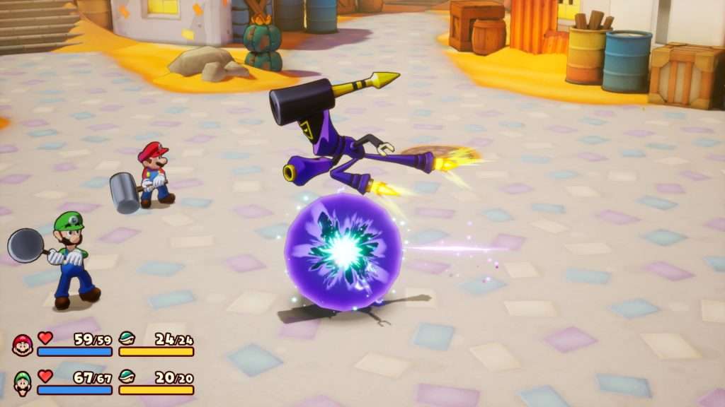 Notre duo commence avec de simples attaques de saut et de marteau, puis vient s’ajouter les attaques frères qui ressemblent beaucoup à ce qu’on a vu dans le passé. On en débloque de plus en plus en avançant dans l’aventure et ce sont celles qui font le plus de dégâts aux ennemis. C’est aussi les plus difficiles à parfaitement synchroniser surtout chez les plus coûteuses qu’on débloque plus tard. Bref, les combats sont le fun, les ennemis sont assez variés pour nous amener à ajuster nos esquives constamment et le niveau de difficulté est pas mal par moment dont les boss qui ne sont pas si simples.