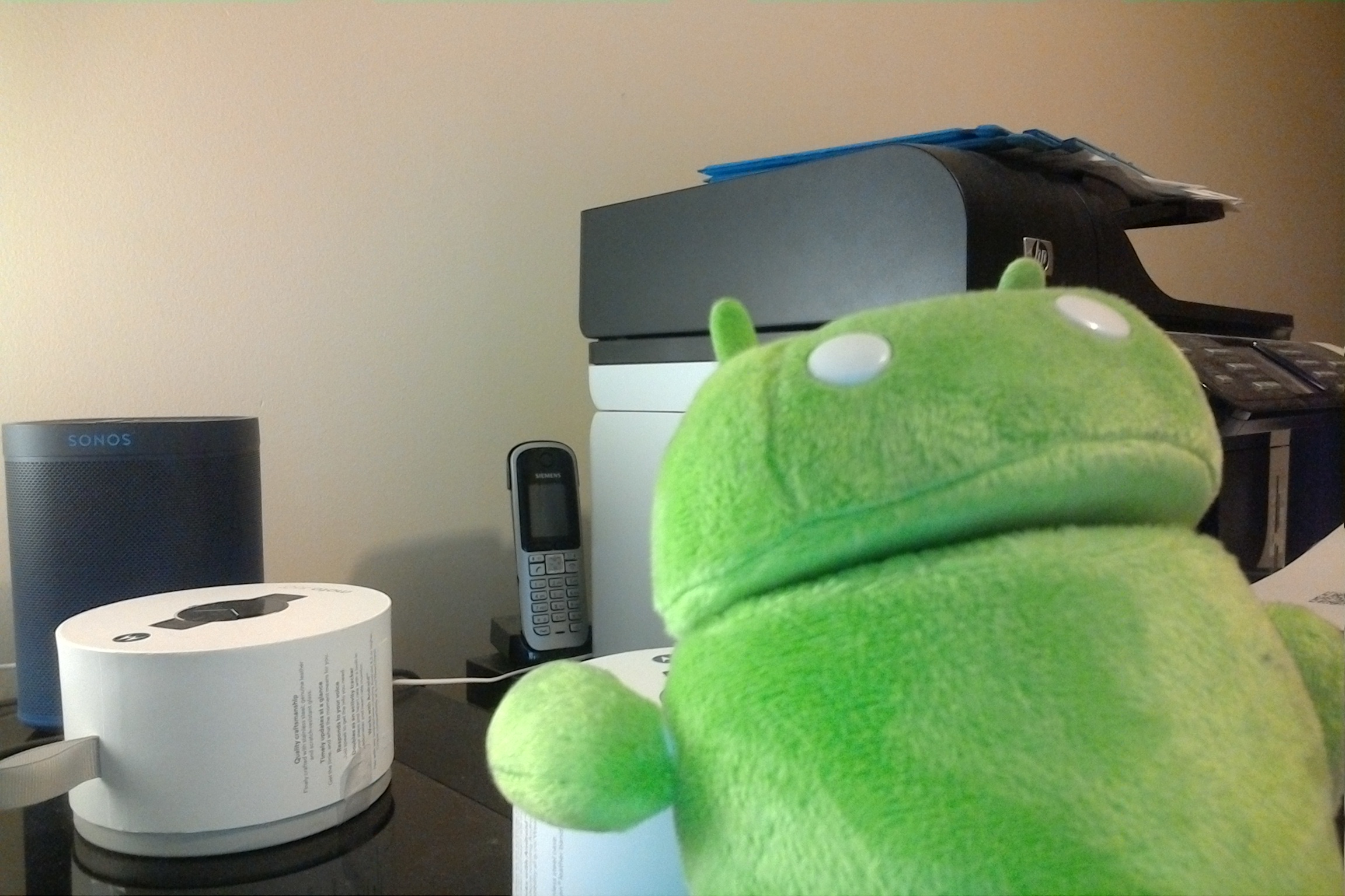 La caméra frontale de la Surface 3 est légèrement moins bonne que celle de la version Pro. On retrouve en effet des couleurs plus foncées, avec le haut-parleur Sonos par exemple qui apparaît noir au lieu de bleu. Le focus est également moins bien géré, avec le bugdroid qui est moins bien détaillé et plus bruité.
