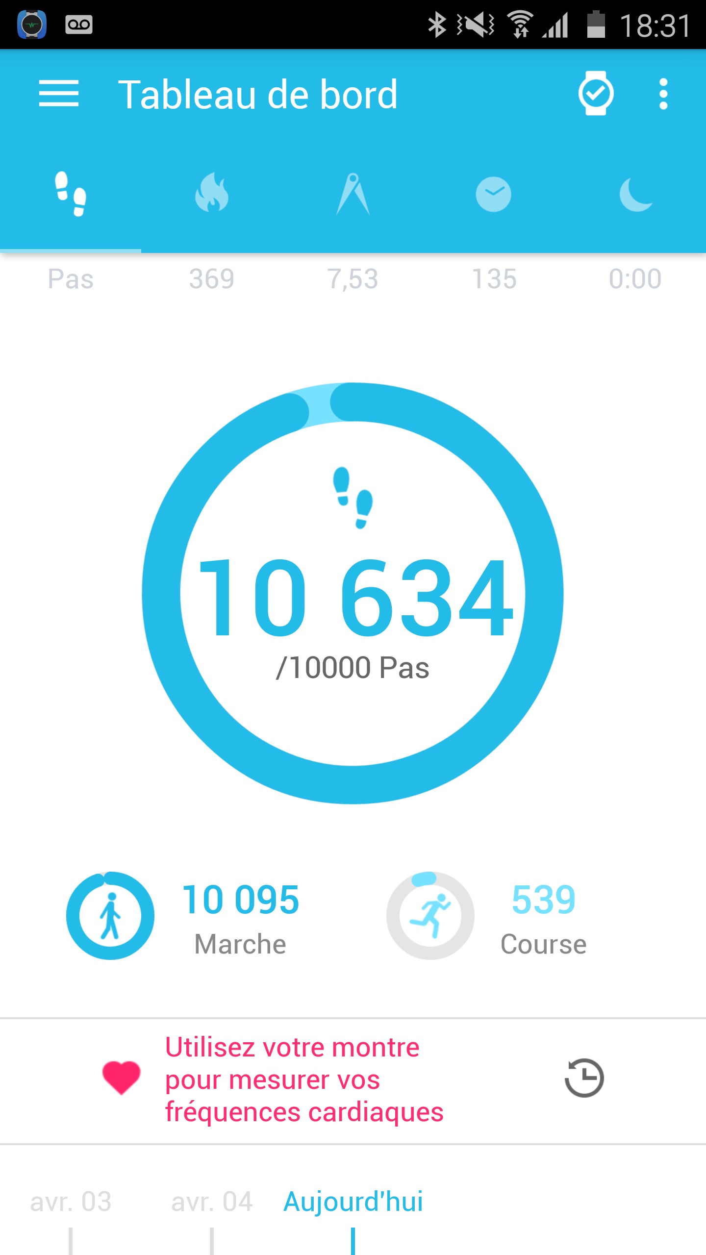 Il est également possible de visualiser le rapport d’activité, de la même manière que sur la montre. Celui-ci reprend exactement le même code couleur et l’affichage sous forme d’un cercle plus ou moins rempli selon le niveau d’atteinte de l’objectif. J’aime également beaucoup la possibilité de visualiser l’activité effectuée sous forme de ligne de temps, à la manière de ce que proposait Sony sur ses Smartband. Si cela met en évidence que le petit objet traque vraiment de manière précise notre journée, cela peut être pratique pour identifier les différentes activités.
