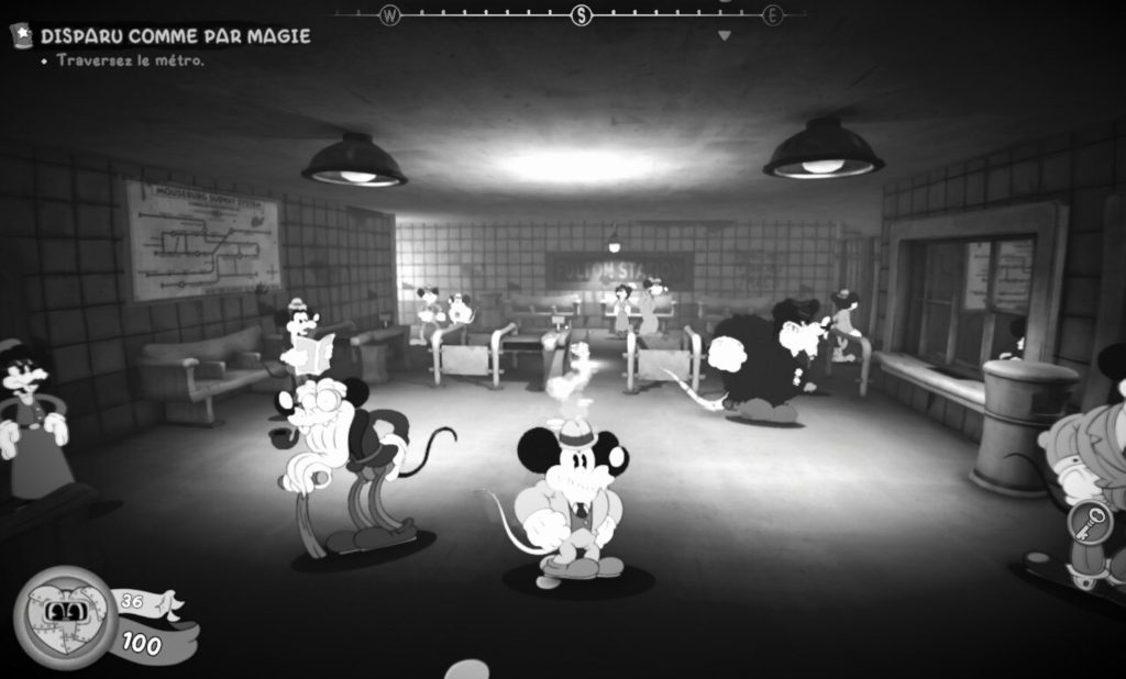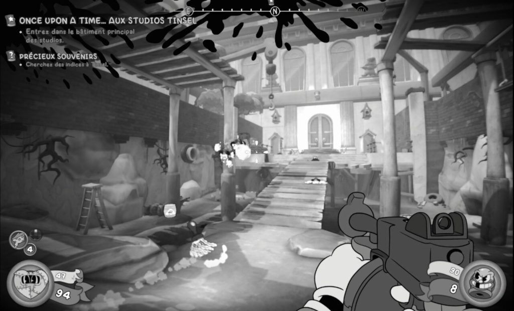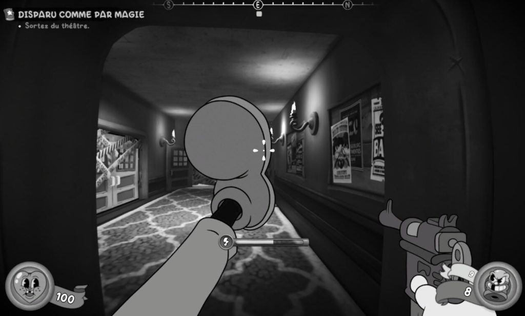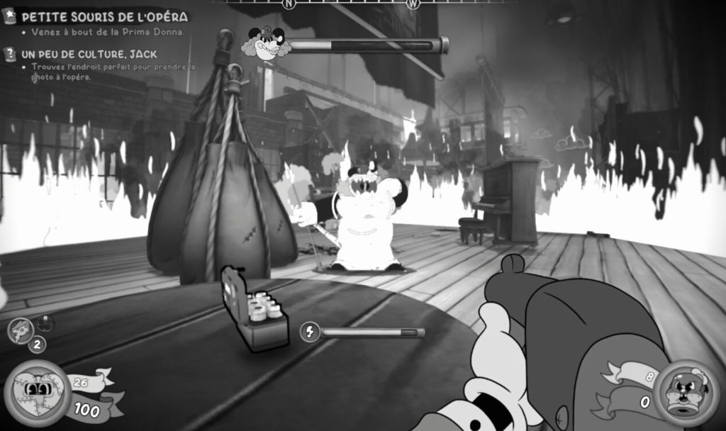 Avant même les phases de jeu, ce qui frappe le plus est la direction artistique. Le studio Fumi Games a réussi à recréer avec une fidélité impressionnante l’esthétique des cartoons des années 30, avec ses personnages aux membres exagérément flexibles, des animations caricaturales et un noir et blanc fortement contrasté. Chaque environnement, chaque ennemi, chaque arme et même chaque effet visuel semble avoir été conçu pour donner l’impression qu’on évolue à l’intérieur d’un dessin animé d’époque. Ce qui m’a le plus impressionné c’est que cette direction artistique ne repose pas uniquement sur l’effet de surprise initial. Même après plusieurs heures de jeu dans MOUSE: P.I. For Hire, le style continue de fonctionner grâce au souci du détail apporté à chaque élément visuel. Les animations sont remplies de personnalité, les environnements débordent de petits détails visuels charmants, et l’ensemble possède une identité visuelle tellement forte.