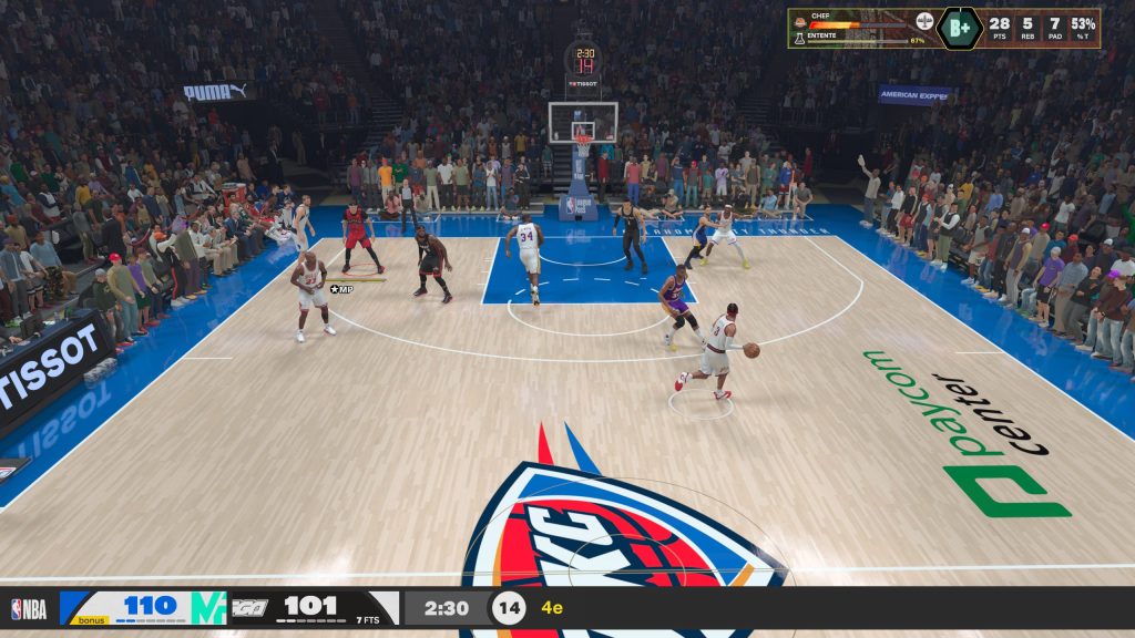 L’un des plus gros changements de NBA 2K26 concerne son tir. Le système repose désormais sur une zone verte plus dynamique, sensible à la défense et à la position du joueur. Il faut s’adapter à chaque situation et un tir ouvert bien préparé a plus de chances d’aboutir qu’un tir forcé. De mon côté, j’ai grandement apprécié ce nouveau système. Selon moi, il permet d’être moins punitifs sans pour autant être trop facile. On ressent une vraie logique sans pour autant devenir frustrant pour ceux qui veulent simplement se faire plaisir. Cet ajustement change beaucoup la dynamique des matchs. On ne joue plus de la même manière et il faut réfléchir aux écrans et au positionnement de nos coéquipiers. Les pénétrations au panier sont plus tranchantes et les contestations défensives sont enfin crédibles.