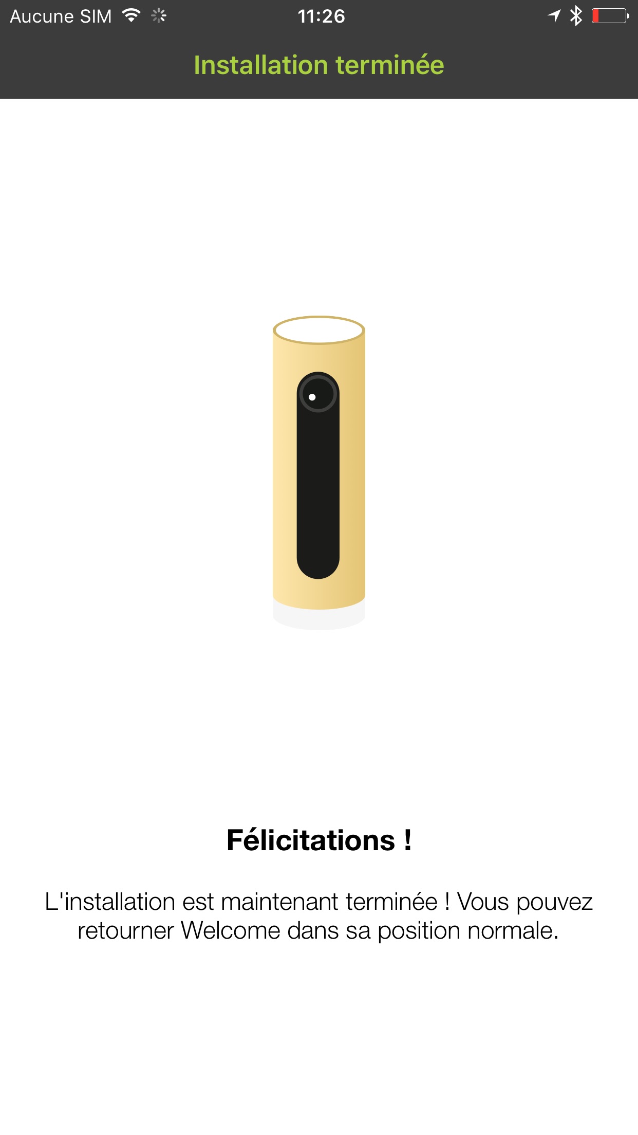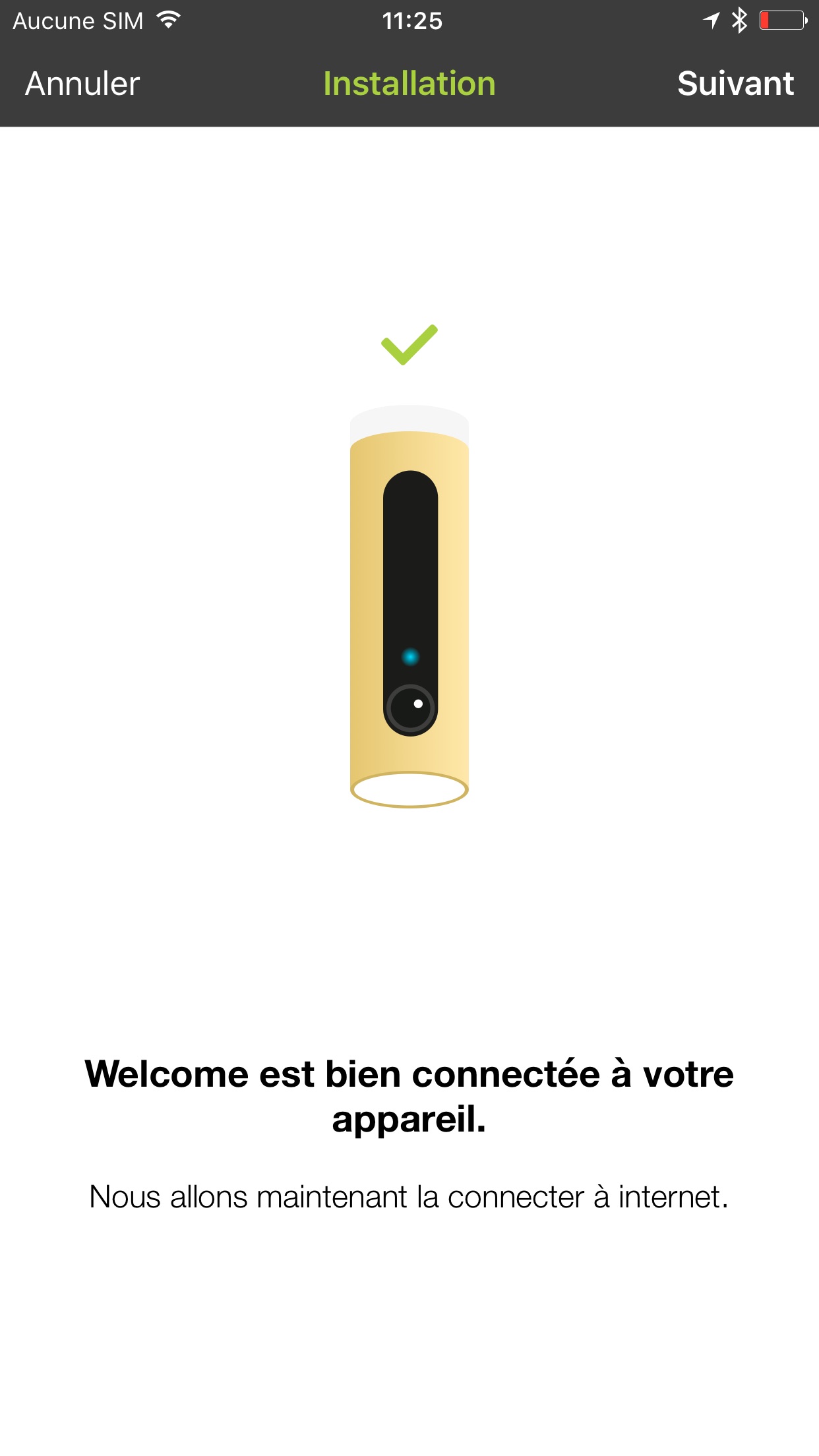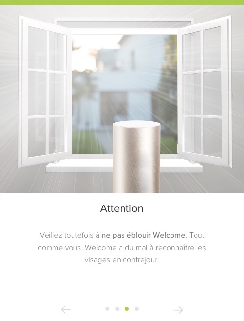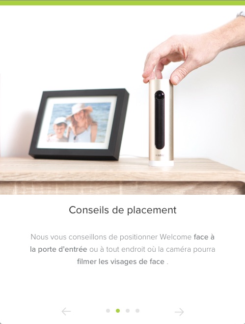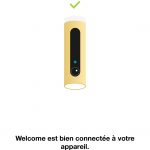 L’installation a été pensée pour être la plus simple possible pour l’utilisateur : il suffit de brancher l’alimentation de la caméra sur le port micro-USB et de la retourner verticalement jusqu’à ce qu’une lumière bleue soit présente. Il suffit ensuite d’installer l’application Welcome, disponible sur Android et iOS. Celle-ci va ainsi guider l’utilisateur dans l’installation, qui consiste principalement en une recherche Bluetooth de la caméra pour la configurer, puis en l’inscription du mot de passe du réseau Wi-Fi pour que celui-ci devienne accessible à l’objet.