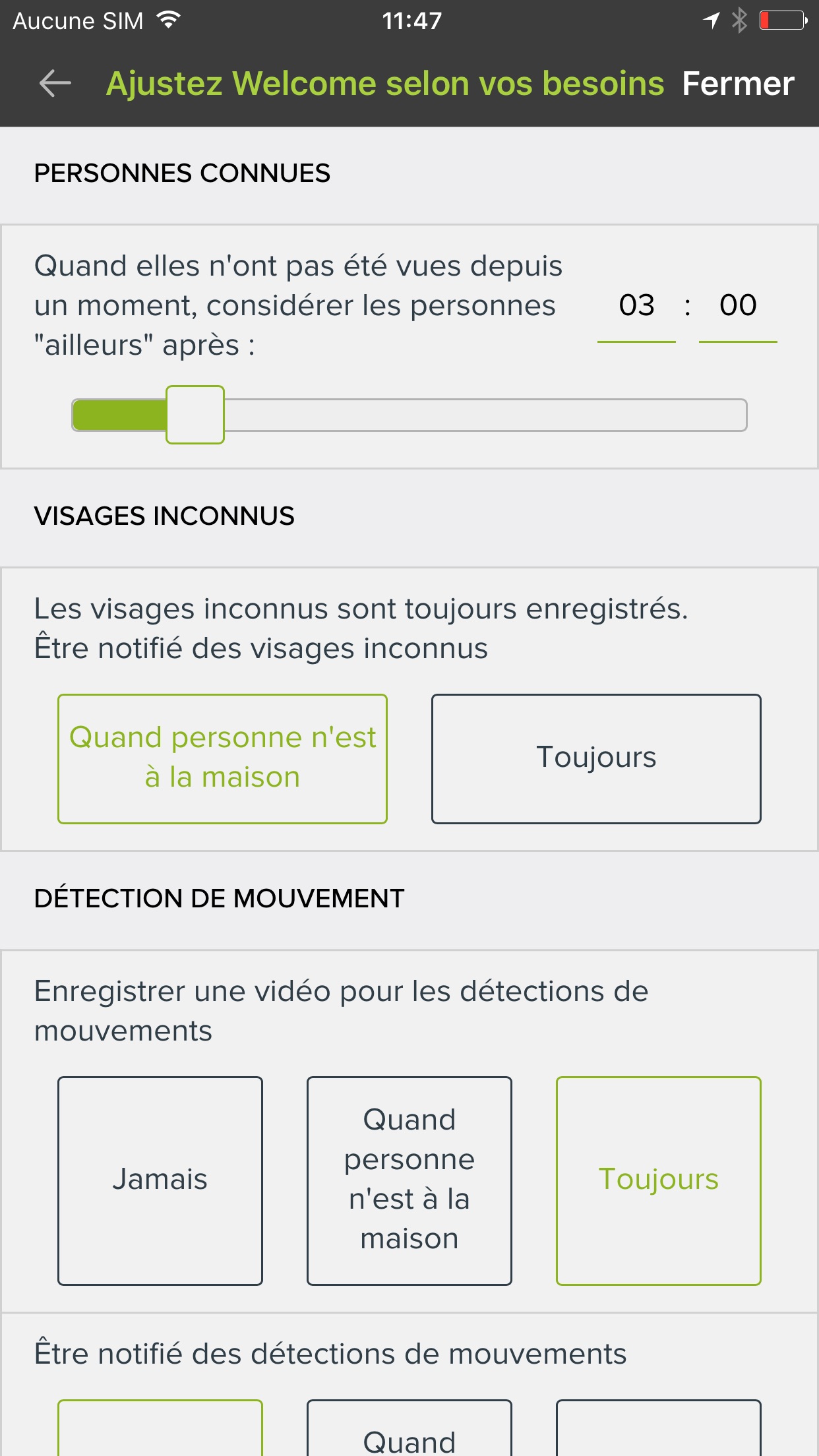 Recevoir des alertes lorsqu’un évènement se produit est pratique, mais uniquement lorsque c’est pertinent. Plusieurs réglages sont donc disponibles pour éviter de recevoir un trop grand nombre d’alertes, lorsque la famille est à la maison par exemple.