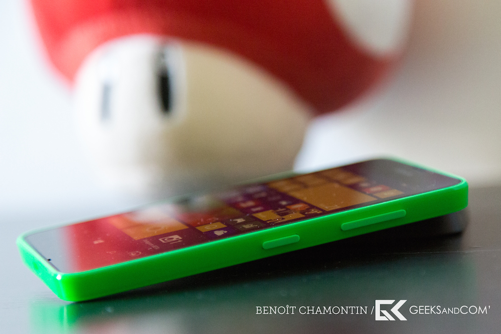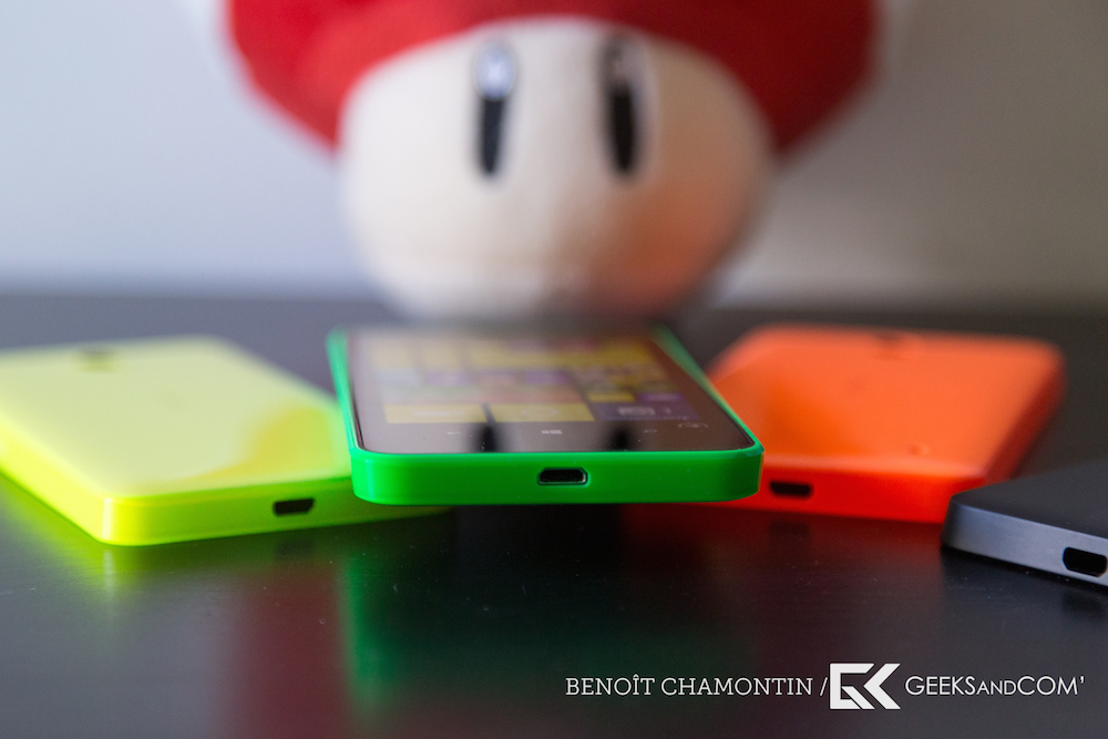 Le plastique est brillant pour toutes les versions colorées, alors qu’il est mat pour la version noire. Les coques colorées, disponibles en orange, jaune ou vert disposent de deux nuances de couleurs, donnant un effet très agréable lorsque la lumière vient se refléter sur l’appareil, comme c’était déjà le cas sur le Nokia Lumia 620.