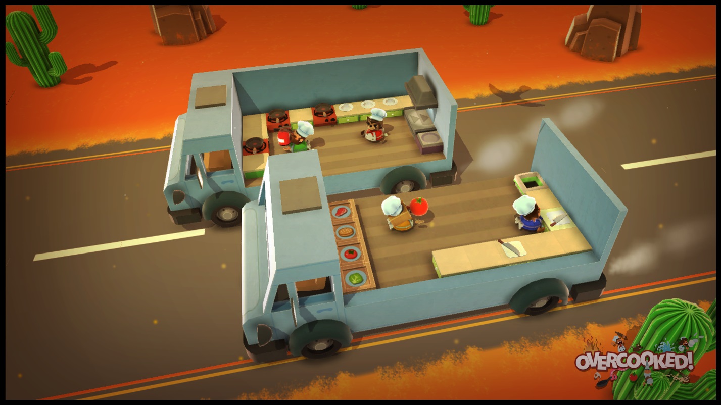 Outre la difficulté que notre équipe peut nous-mêmes se créer dans Overcooked, les développeurs de Ghost Town Games n’ont pas rendu la tâche facile. La conception des niveaux est très bien réalisée et chaque étape de la campagne propose un élément augmentant progressivement la difficulté du titre. Un peu à la manière d’un jeu de casse-têtes, les tableaux s’adapteront au fur et à mesure du scénario. Par exemple, vous pourrez être sur un bateau qui tangue et change la configuration de la cuisine toutes les 30 secondes ou encore être sur un glacier avec le sol glissant qui peut faire tomber le cuisinier et ses plats à l’eau. Même si en général, il est assez facile d’atteindre l’objectif minimal afin de déverrouiller la prochaine étape, les joueurs les plus pointilleux voudront sans aucun doute récolter les trois étoiles sur chacun des niveaux. Au total, c’est plus de 28 niveaux à la difficulté progressive dans des environnements variés que propose Overcooked.
