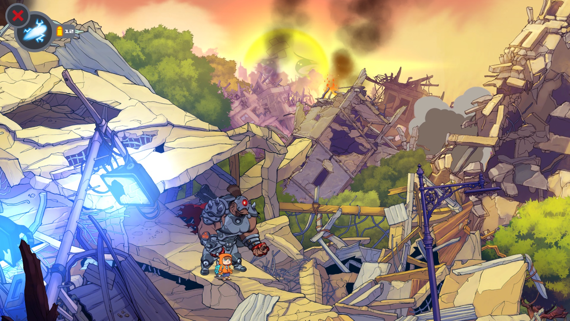 Là où Rise & Shine se démarquent le plus selon moi c’est au niveau du graphisme qui nous donne l’impression de jouer à une série animée interactive. En effet, le style visuel me rappelle certains dessins animés que j’ai vus à la télévision étant plus jeune, mais avec des effets spéciaux pour un public mature et averti. En plus, les décors et les personnages sont dessinés avec des couleurs brillantes et très diversifiés ce qui amène un peu de joie, malgré la violence intense du jeu. Je trouve aussi que les développeurs ont fait de l’excellent boulot au niveau de la diversité des designs des personnages qui sont très différents les uns des autres et les Boss le sont tout autant. J’ai été très impressionné par l’originalité de ceux-ci et le tout vient avec une musique qui nous plonge en plus dans ce jeu d’action.