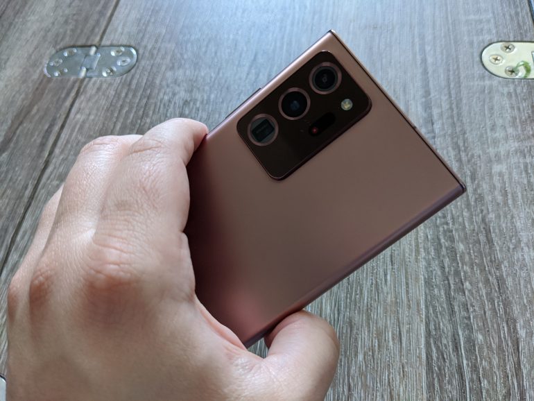 Si les coques arrière respectives des S20 Ultra et Note10+ profitaient d’un fini lustré qui pouvait presque servir de miroir, celle du Note 20 Ultra est quelque peu différente. En effet, le nouveau tablettophone de Samsung a plutôt un look brossé qui se prête bien à son nom de couleur : bronze mystérieux.