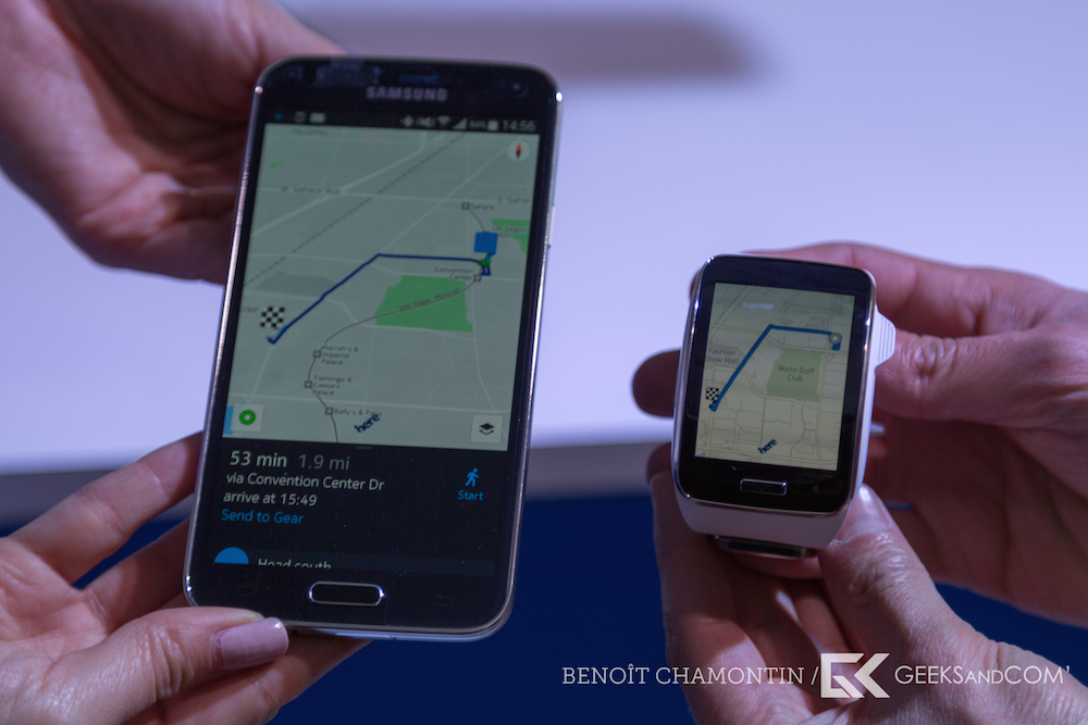 C’est l’une des fonctionnalités les plus intéressantes de la montre, pour ceux qui cherchent souvent leur chemin. L’application Here Maps de Nokia est en effet préinstallée directement dans la montre (comme nous vous en parlions lors du CES 2015), et celle-ci est utilisable de manière entièrement autonome. Bien entendu, il est également possible d’interagir d’abord sur son téléphone et d’envoyer la carte vers la montre, mais tout peut se faire directement sur le clavier de la Gear S, ou grâce à la recherche vocale.