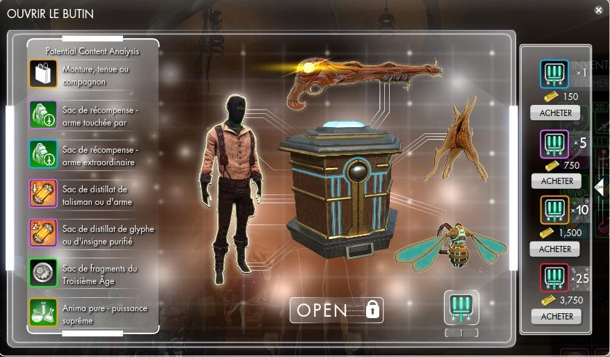 Le coût est d’environs (2 €/2,50 $) par clé et les objets à l’intérieur varient entre esthétiques et d’autres plus concrets comme des gains de points d’expérience. Rapidement, les joueurs qui n’achètent pas de clés ou n’ont pas d’abonnement mensuel se retrouveront avec des dizaines, voire des centaines de coffres qui ne leur servent à rien sauf à les vendre pour une autre forme de crédit dans le jeu qui n’a que très peu de valeur.