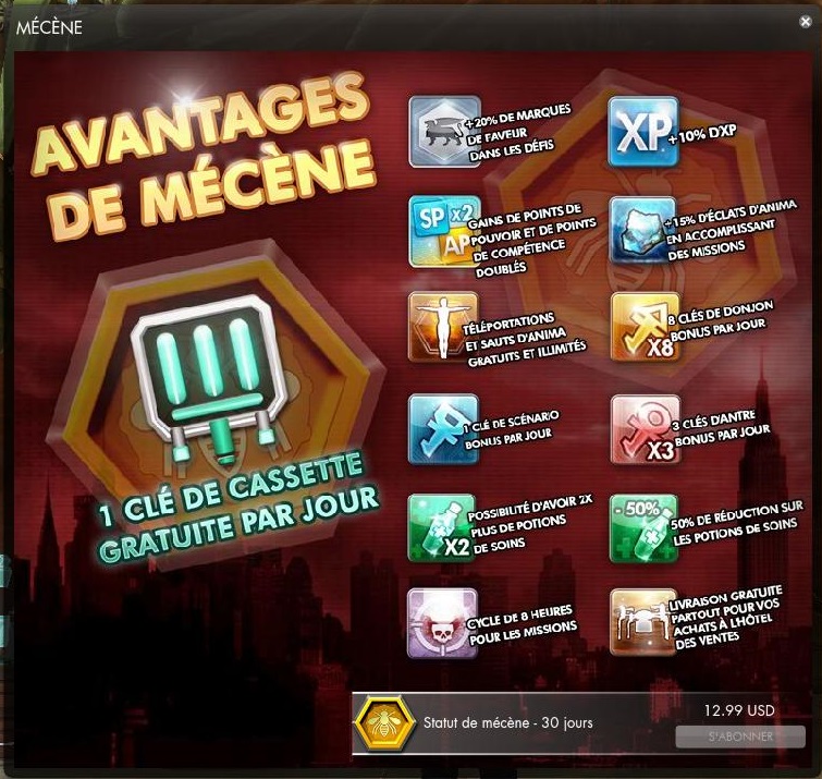 12,99 USD soit environ 12 € ou 18 $ canadien. Elle vous permet d’avoir accès à 6 clés de donjons supplémentaires, le DOUBLE des points de compétence, plus de potions, des potions moins chères, une clé qui permet d’ouvrir un coffre mentionné plus haut, etc.