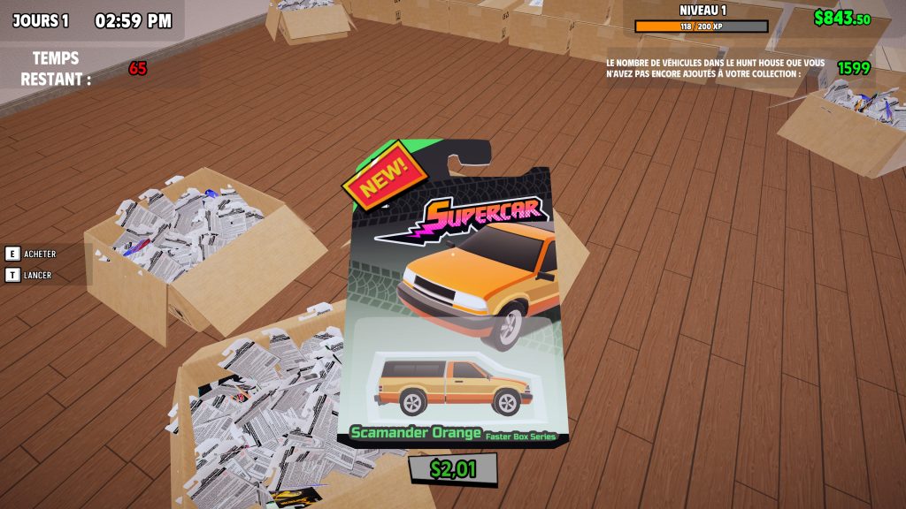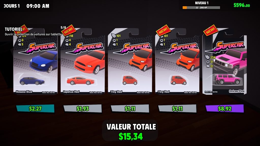 Supercar Collection Simulator reprend la base de créer sa boutique afin de générer des ventes pour améliorer celle-ci et ainsi de suite. Là ou tente de se démarquer le jeu c’est dans le reste de son concept. Déjà, la collection des voitures miniatures est, un peu comme les jeux de carte à collectionner, un univers niche, mais unique. De cette manière, le sujet est déjà un peu plus intéressant qu’une simple copie d’un supermarché. Par la suite, les développeurs du studio Kiki Games ont aussi intégrer un marché qui s’ouvre quotidiennement. On peut, donc, y chasser de nouvelles petites voitures à ajouter à notre collection. Ce rituel quotidien donne au jeu un rythme plaisant, presque comme une chasse au trésor moderne.