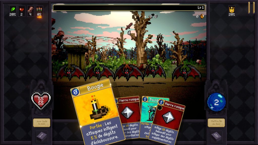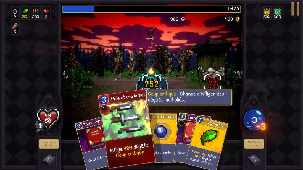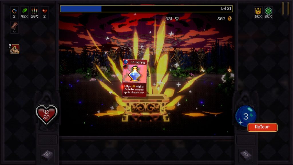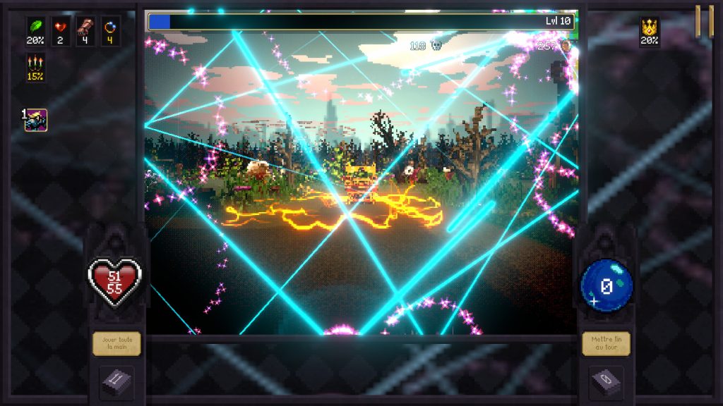 Les combats sont également très réussis. L’action demeure lisible malgré le chaos visuel qui s’installe progressivement, et les affrontements deviennent rapidement spectaculaires lorsque nos cartes commencent à atteindre leur plein potentiel. Là où Vampire Crawlers perd quelques points face à son illustre prédécesseur, c’est dans sa capacité à maintenir l’addiction sur le très long terme. Aussi solide soit-il, le jeu devient répétitif plus rapidement que Vampire Survivors, et ce, même si sa formule demeure extrêmement plaisante. Le rythme plus posé du dungeon crawler réduit légèrement cette sensation de chaos constant. Là où le précédent titre nous bombardait sans arrêt de stimuli, d’ennemis et de gratification immédiate, cette nouvelle aventure adopte une structure plus méthodique.