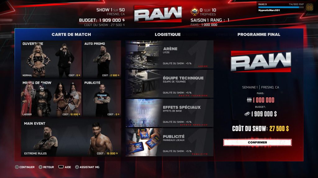 Tout d’abord, le mode Mon MG fait son retour avec plusieurs améliorations. Ce mode de gestion permet de prendre le contrôle d’une émission de lutte et de rivaliser contre l’intelligence artificielle pour produire le spectacle le plus populaire. Cette année, davantage de types de matchs sont disponibles et la structure des saisons offre plus de possibilités pour construire ses rivalités et développer son circuit. Pour les amateurs de gestion, c’est un terrain de jeu particulièrement intéressant. On a même la possibilité de jouer les matchs ou de les simuler. De mon côté, je ne connaissais pas encore ce mode de jeu et au moment d’écrire ces lignes, j’ai passé plusieurs heures déjà.