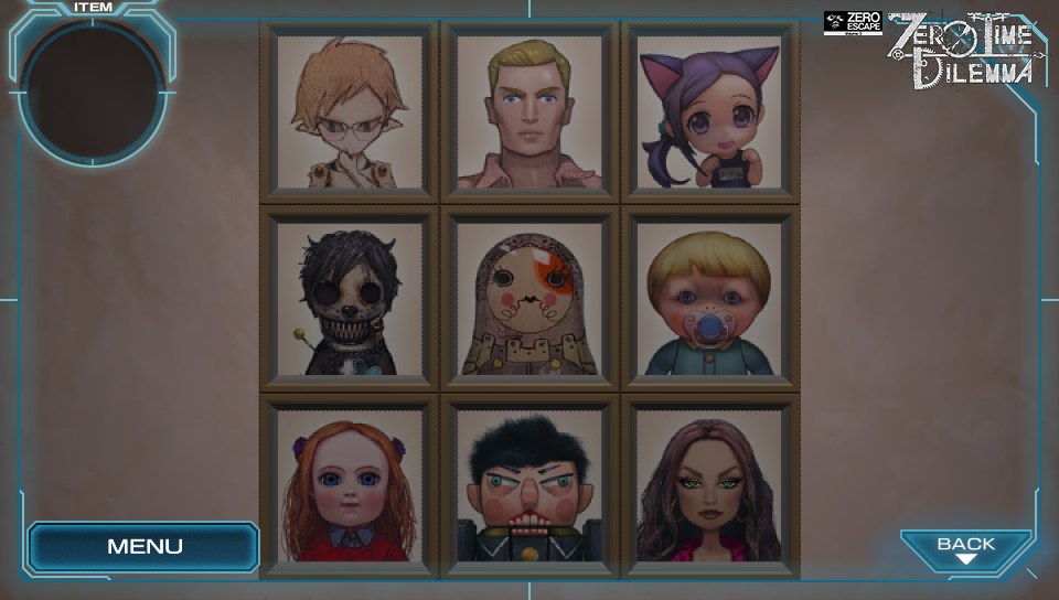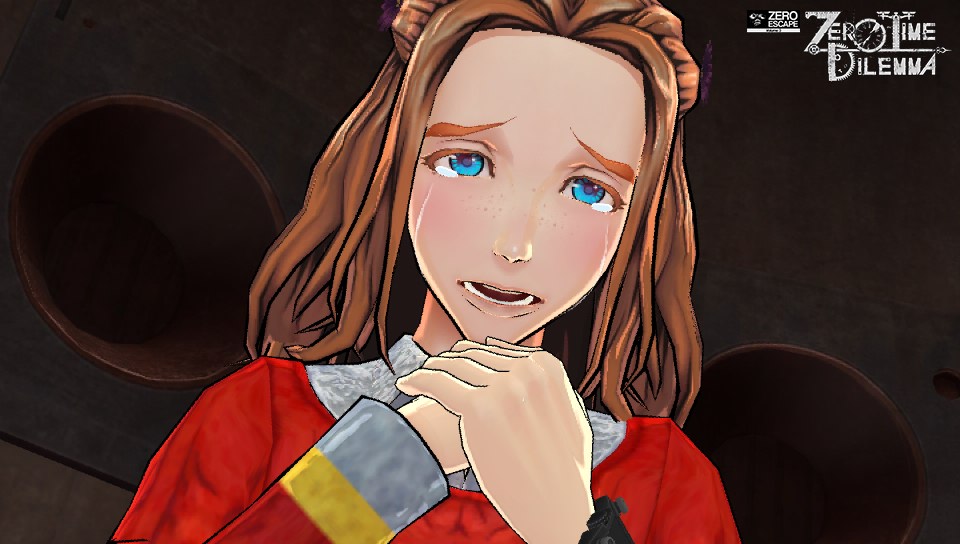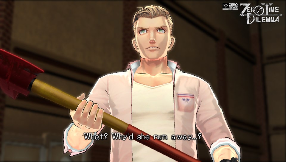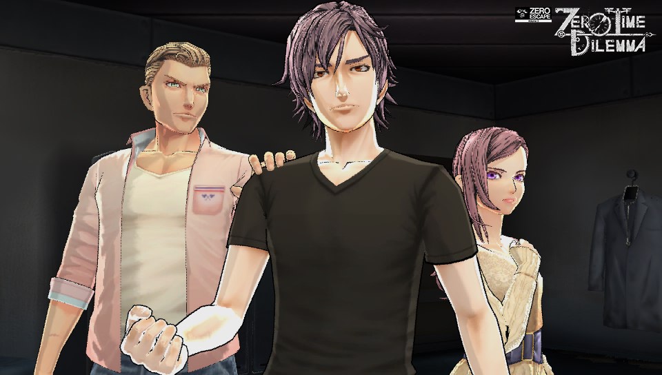 En fait, le mot conclusion est peut-être un peu mal choisi puisque les événements de ce titre se déroulent entre le 1er et 2e volume de la série. Tout comme dans les opus précédents, Zero Time Dilemma nous présente neuf personnages qui se sont fait capturer à leur insu par un mystérieux personnage nommé Zero. L’étranger leur dévoile alors qu’ils sont emprisonnés dans un énorme bunker nucléaire dans lequel ils seront obligés de participer à son jeu de décisions. L’endroit est d’ailleurs séparé en trois sections ce qui divise donc les neuf personnages en trois équipes égales. On retrouve l’équipe C de Carlos, Junpei et Akane. Puis, il y a l’équipe D de Diana, Sigma et Phi. Enfin, la dernière équipe est composée de Q, Sara et Eric. Pour s’enfuir, les participants auront besoin d’obtenir six mots de passe qui ne pourront être obtenus qu’à la mort de six d’entre eux. Saurez-vous faire les choix difficiles pour vous échapper?