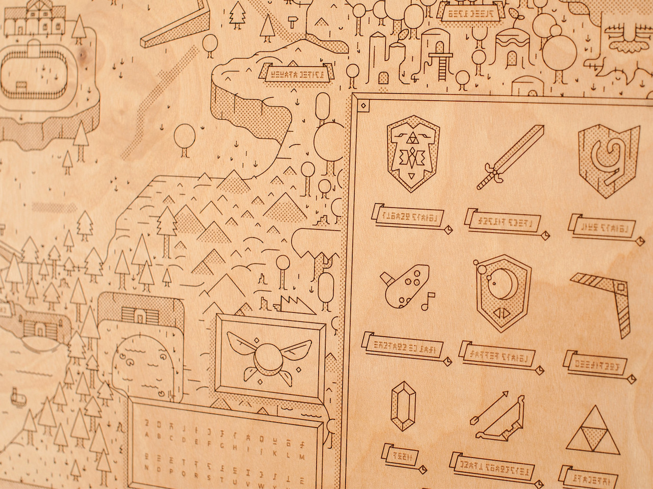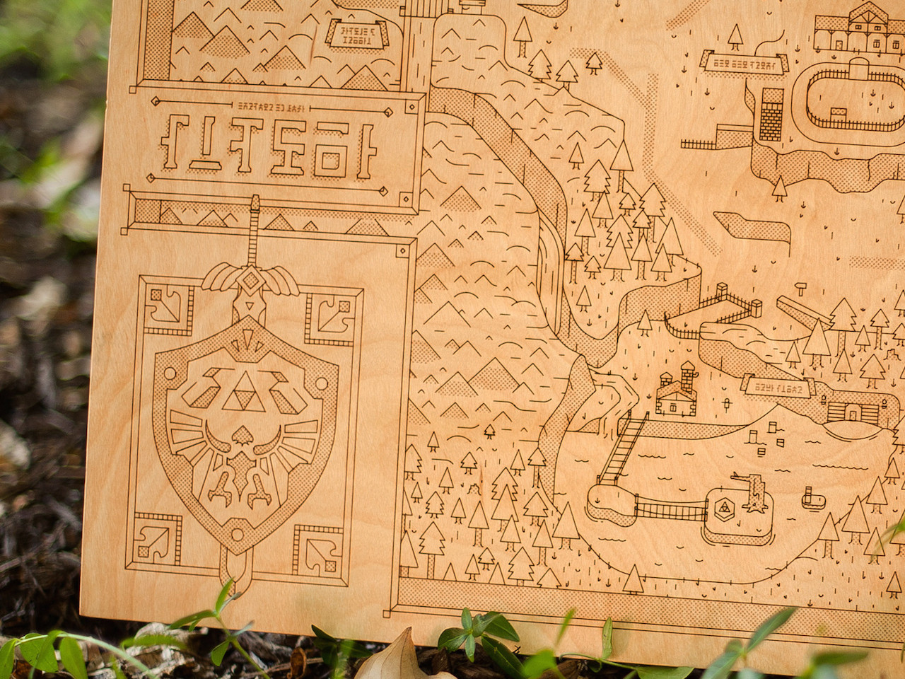 Le designer Alex Griendlingn vient de créer une carte en bois de 60,96 x 45,72 cms du monde d’Hyrule. Pour cela il s’est basé sur sur The Legend of Zelda: Ocarina of Time pour N64 mais également The Legend of Zelda: A Link Between Worlds.