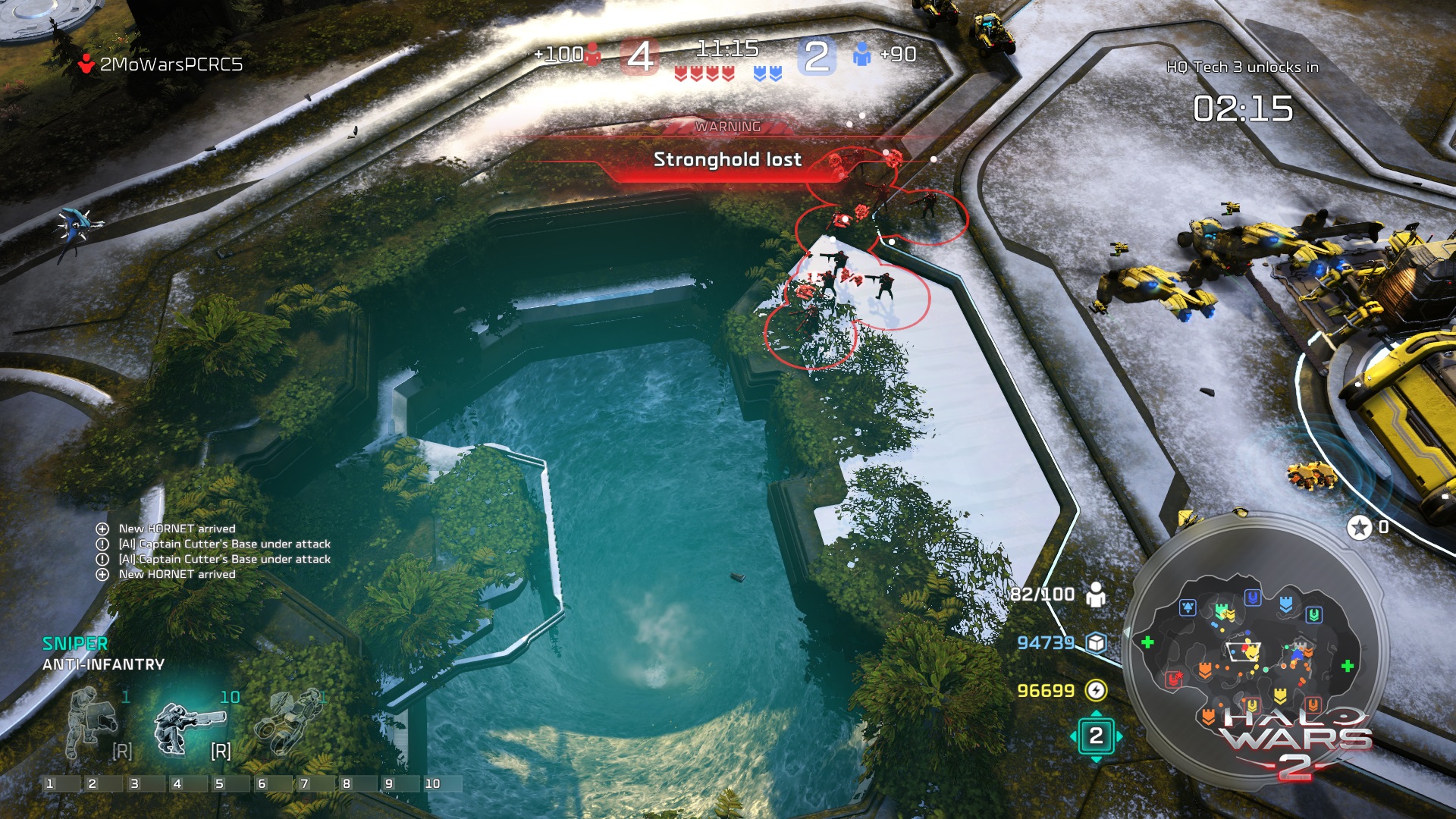 Finalement, notre session de Halo Wars 2 s’est conclue avec quelques parties du nouveau mode Blitz qui est le mode multijoueur idéal si vous n’avez pas le temps de vous lancer dans une longue partie de 45 minutes à 3 heures. Au lieu d’accumuler des ressources et bâtir tranquillement vos forces, vous créerez votre propre paquet de cartes qui va vous permettre de faire apparaître des soldats immédiatement sur le terrain.