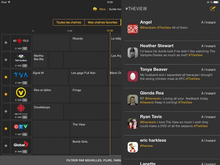Enfin, l’application intègre également un volet social comme cela devient la norme pour les applications deuxième écran des chaînes ou des diffuseurs. Ainsi, lorsque l’on regarde un programme (en direct et enregistré), il est possible d’activer une vue Twitter et Facebook pour participer à la conversation directement ou revivre ce qu’il s’est dit sur le programme. L’affichage se fera uniquement sur la tablette et le hashtag (mot-clic) intégré sera lié à celui que la chaîne transmet.