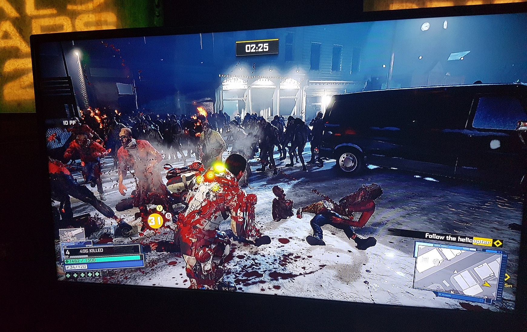 Durant ma deuxième session, j’ai eu l’occasion d’essayer deux des véhicules ce qui m’a permis de décupler mon nombre de zombies tués faisant grimper mon total à 1600. Se promener au milieu de cette horde interminable d’ennemis et de les déchiqueter avec la tourelle de mon bolide était assez surréaliste. En plus, la fluidité était vraiment au rendez-vous et je n’ai jamais senti de ralentissement. Le seul point négatif que j’ai remarqué c’était la conduite complètement horrible, mais un des développeurs présents a expliqué qu’ils avaient peaufiné le tout depuis la sortie de cette démo.