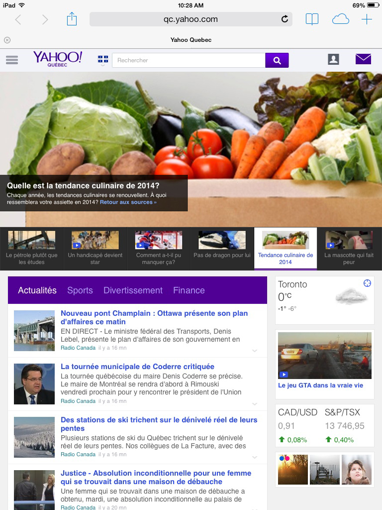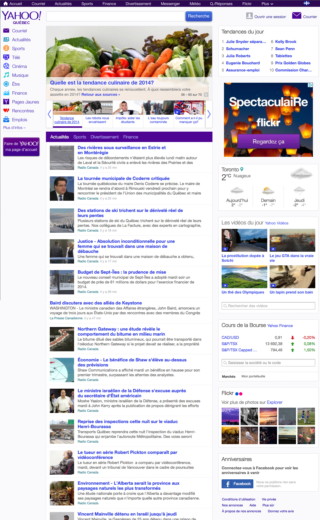 Après les États-Unis en février 2013 puis la France en novembre 2013 notamment, Yahoo lance sa nouvelle page d’accueil à travers le Canada et au Québec. Ainsi les pages Yahoo Québec et Yahoo Canada présentent aujourd’hui le nouveau design et intègrent également de nouvelles fonctionnalités et améliorations que l’on retrouve tant sur le Web qu’en version mobile.