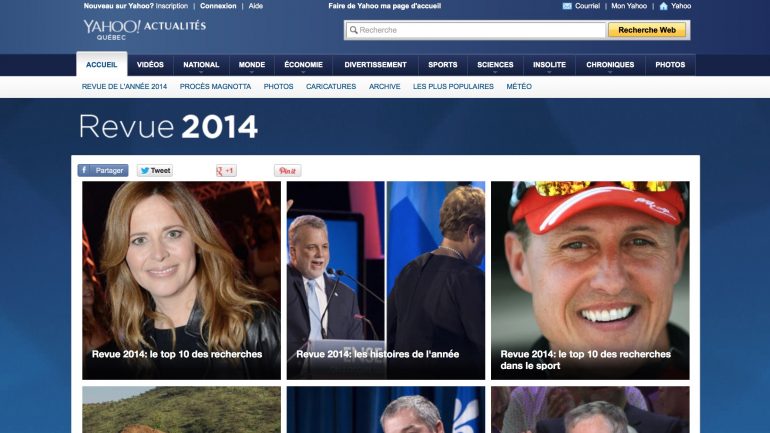 Le mois de décembre est là et c’est donc la période où l’on voit arriver les classements de l’année et le bilan des différentes compagnies notamment sur le Web. Yahoo Québec n’échappe pas à la règle puisque l’entreprise vient de mettre en place sa page spéciale Revue de l’année 2014 (histoires de l’année, vidéos de l’année, faux pas, 10 nouvelles scientifiques…). On y découvre ainsi le classement des mots clés les plus recherchés sur Yahoo Québec en 2014.
